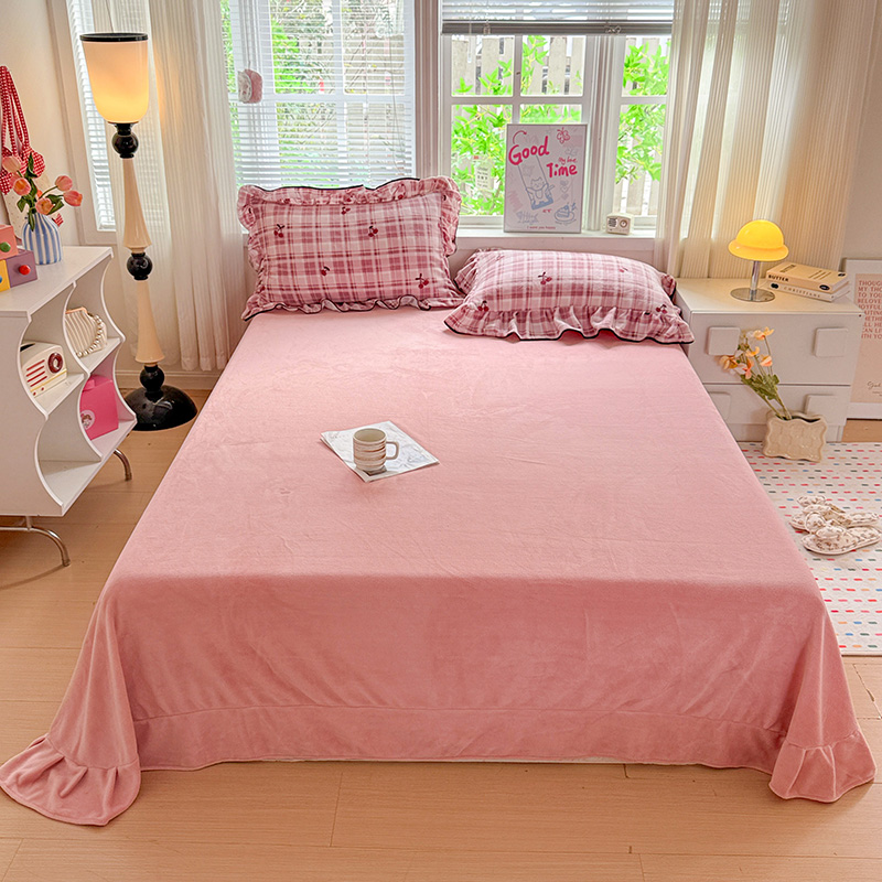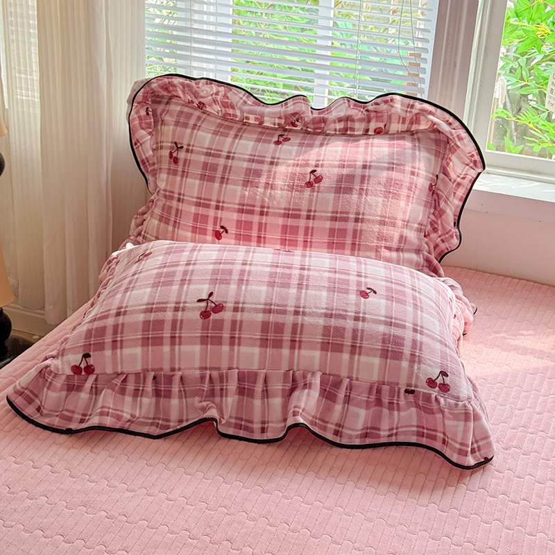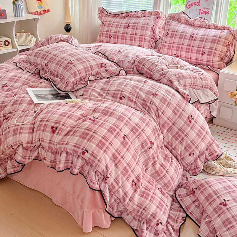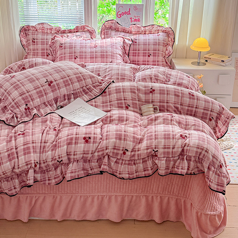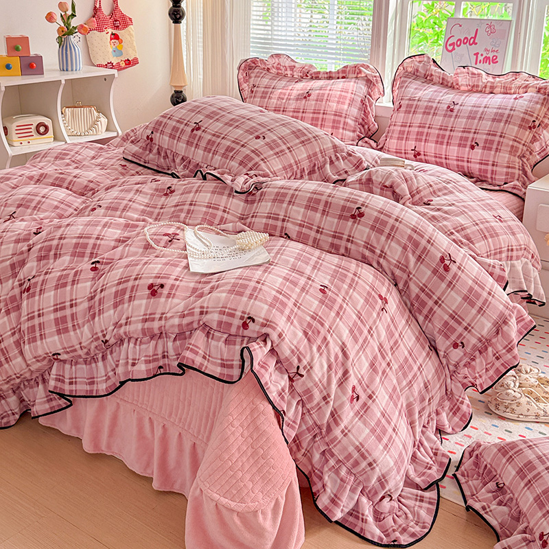 梦莱斯 2025新款加厚保暖双面牛奶绒四件套-黑色花边款 格子樱桃
