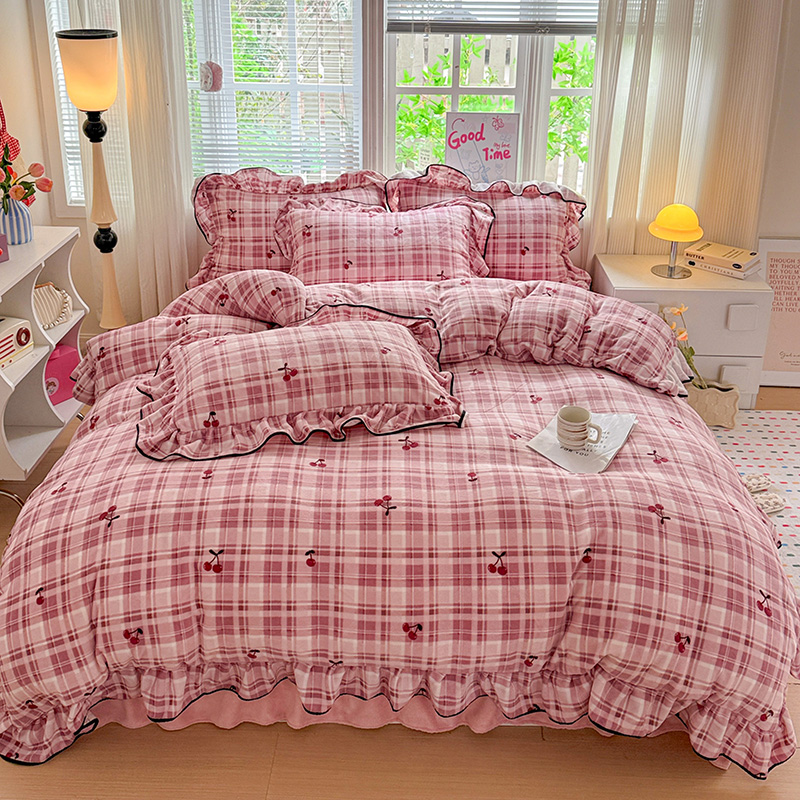 商品名称:梦莱斯 2025新款加厚保暖双面牛奶绒四件套-黑色花边款 格子樱桃