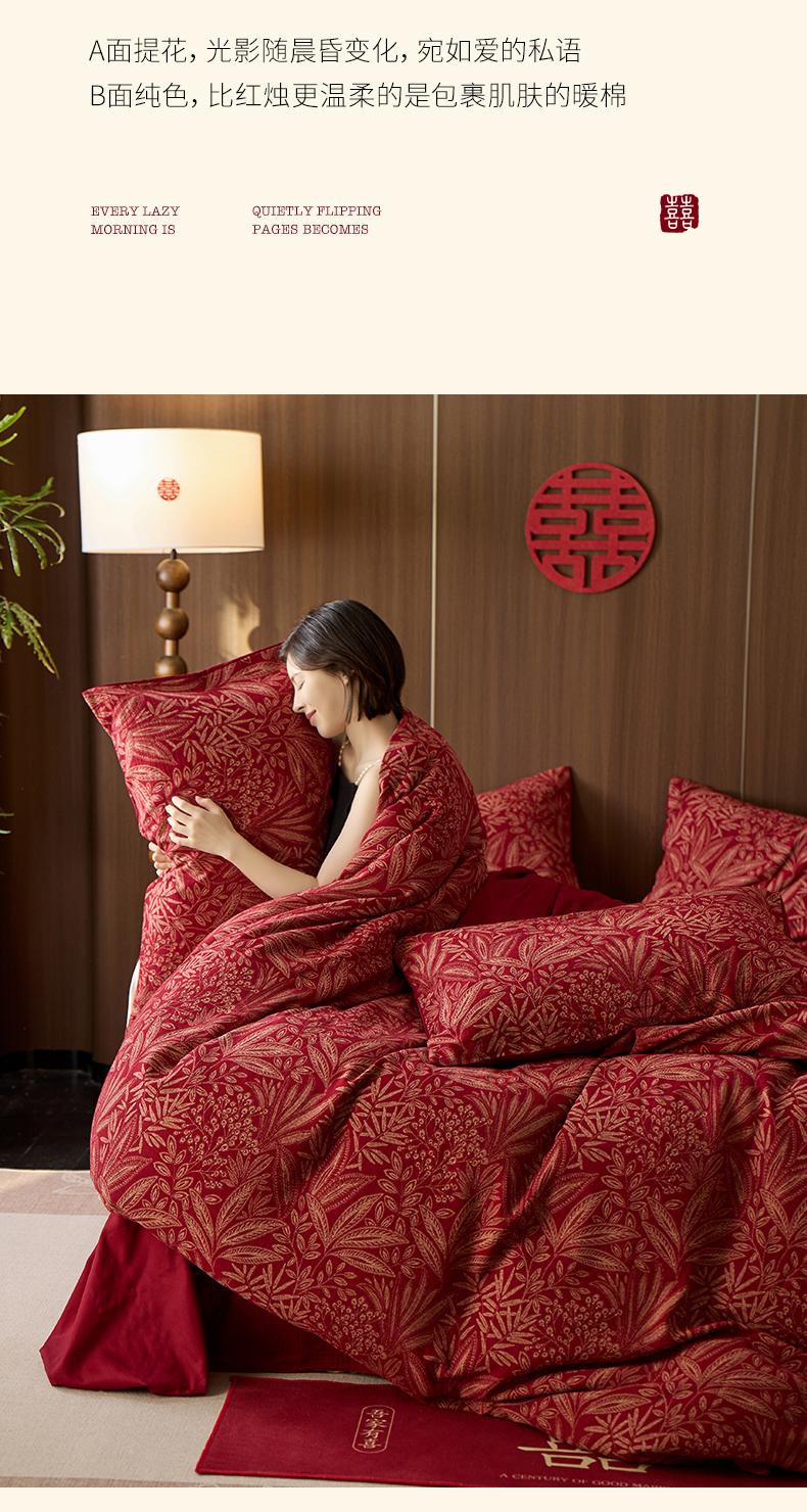 安莱生活 2025新品全棉色织提花(大红婚庆 )四件套 囍意满床