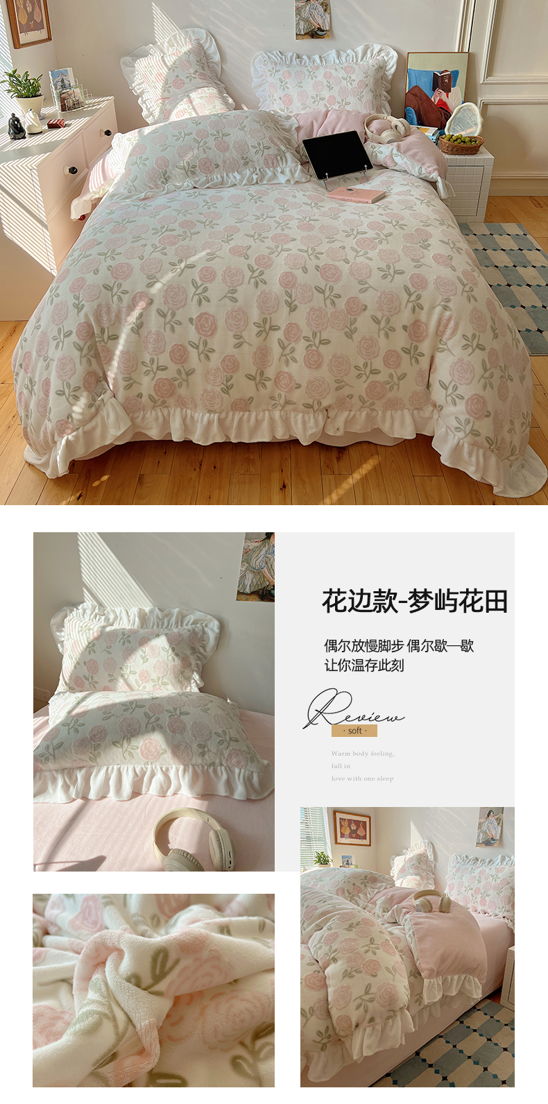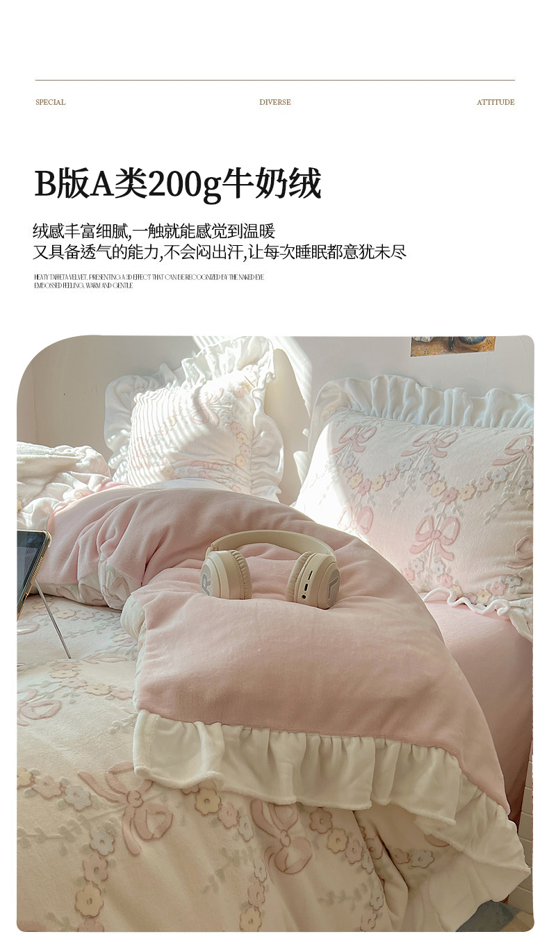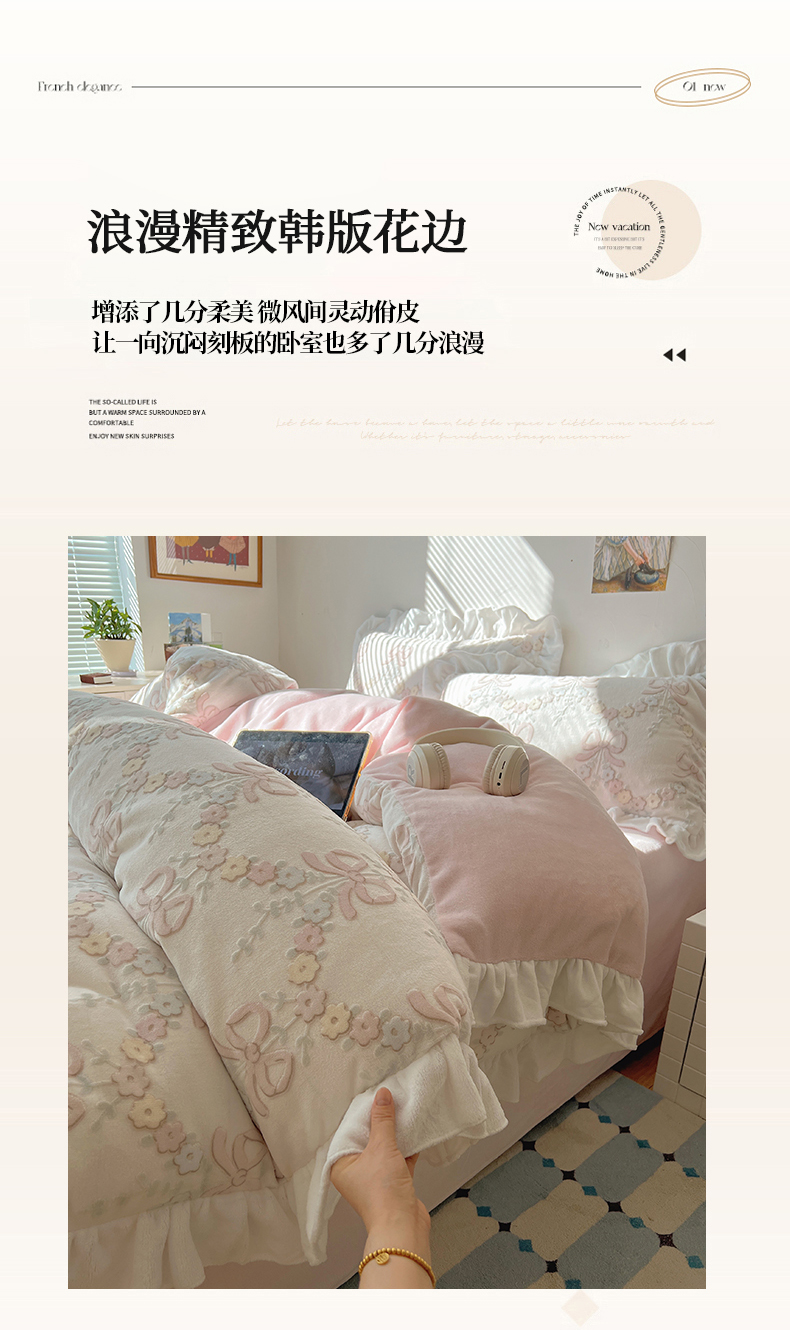 当前位置: 91家纺网 > 商品网购 > 床品套件 > 四件套 > 牛奶绒四件套 > 六巷胡同 2025新款韩系小清新博主风着色立体雕花A类牛奶绒四件套 花边款-星野漫溯