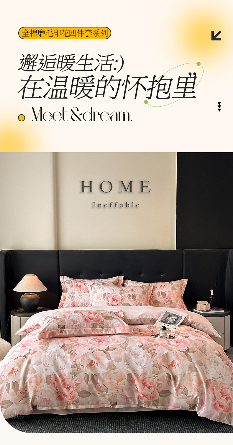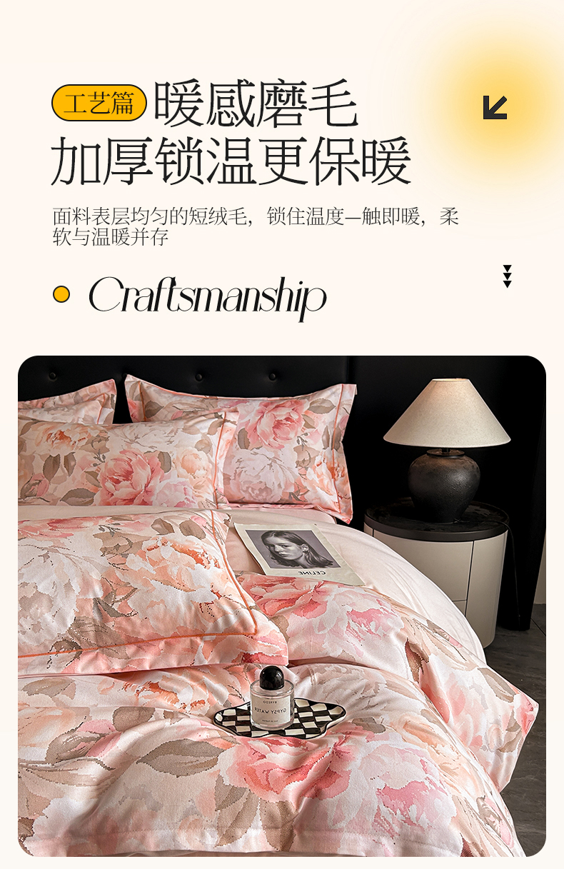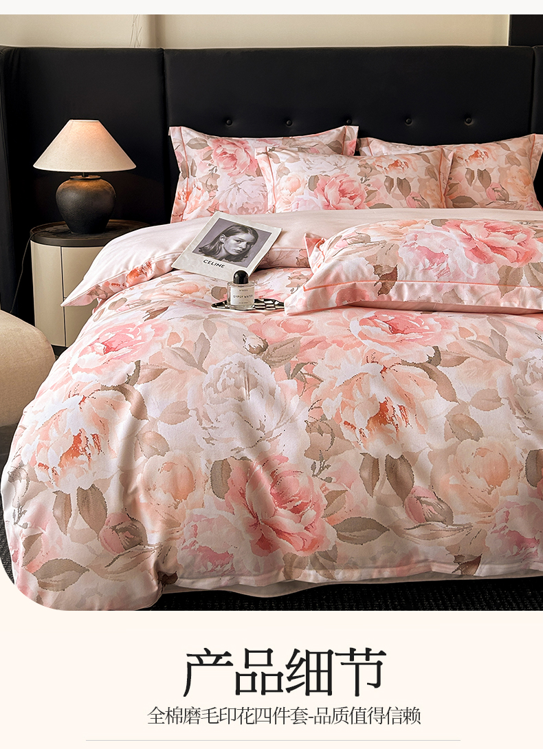 玉海棠家纺 2025新款数码印花加厚全棉磨毛四件套 粉色罗曼使