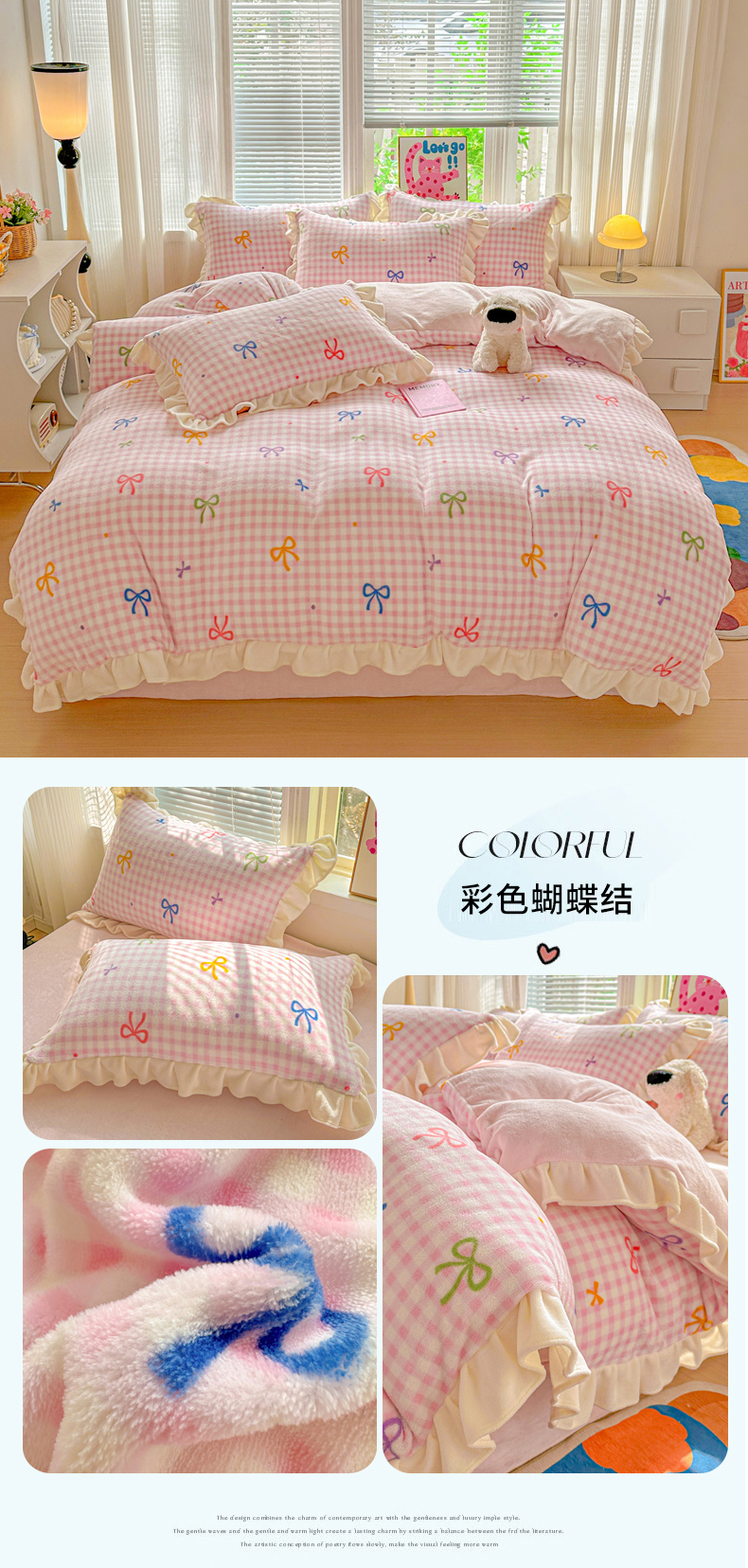 当前位置: 91家纺网 > 商品网购 > 床品套件 > 四件套 > 牛奶绒四件套 > N先生+V 13814689556 发大图/买家秀 2025新款韩式博主风花边款ins卡通牛奶绒四件套 彩色蝴蝶结