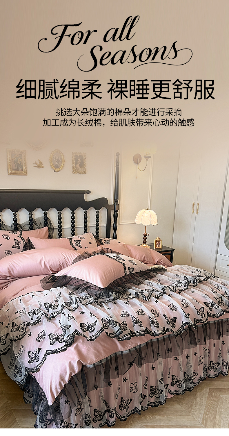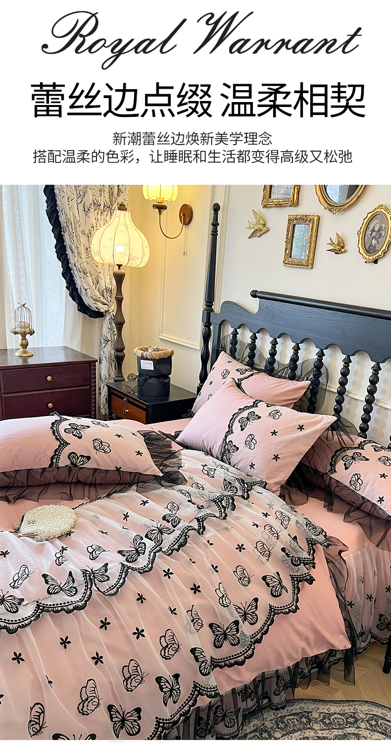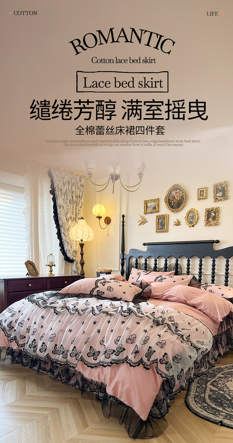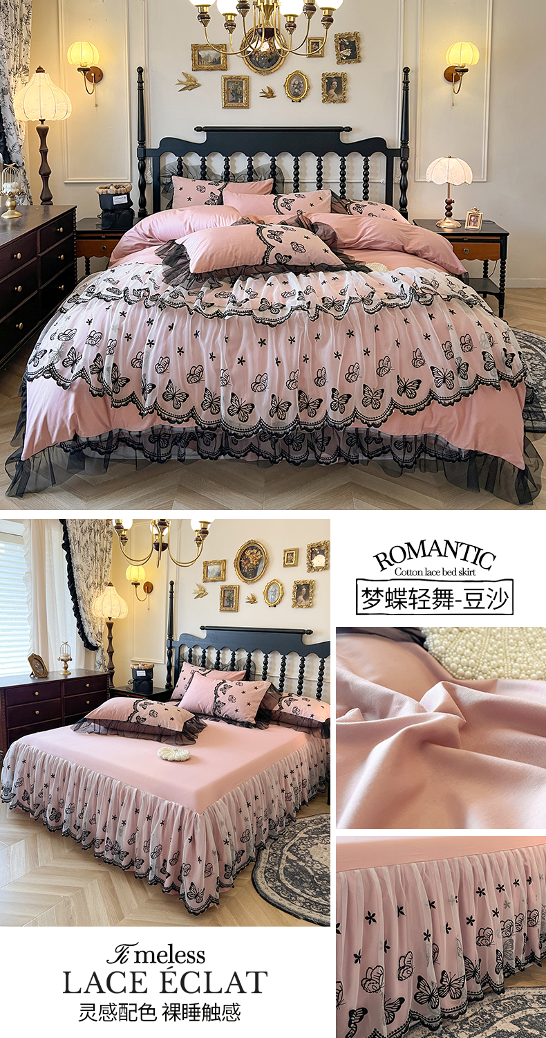当前位置: 91家纺网 > 商品网购 > 床品套件 > 四件套 > 全棉普通四件套 > 网红馆(ck家纺) 2025新款全棉纯棉蕾丝边床裙款四件套-梦蝶轻舞 梦蝶轻舞-豆沙
