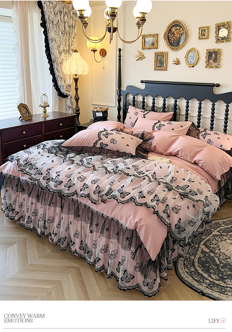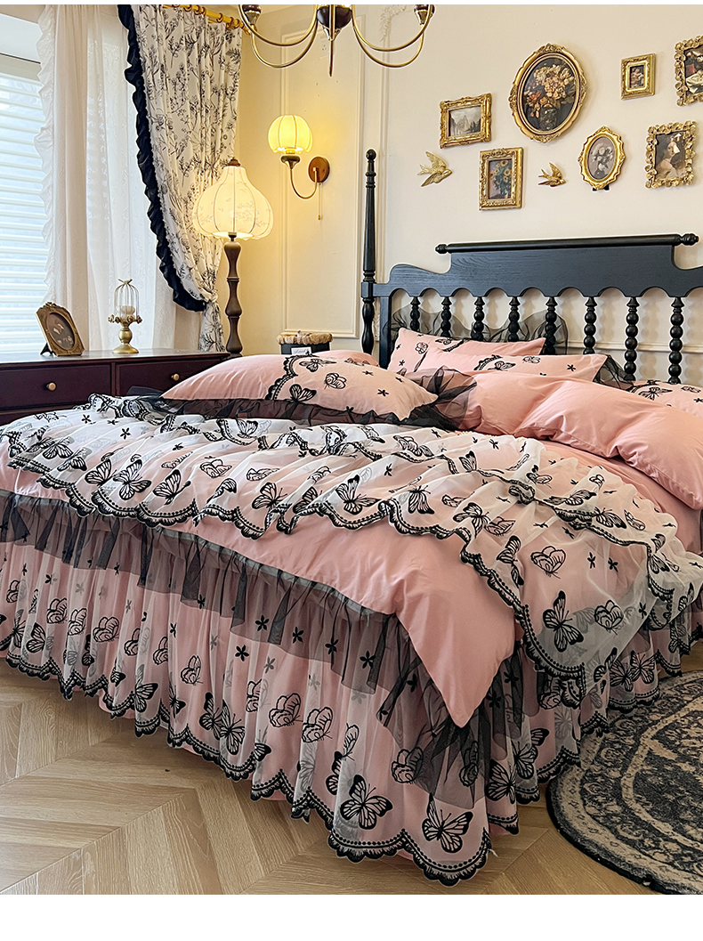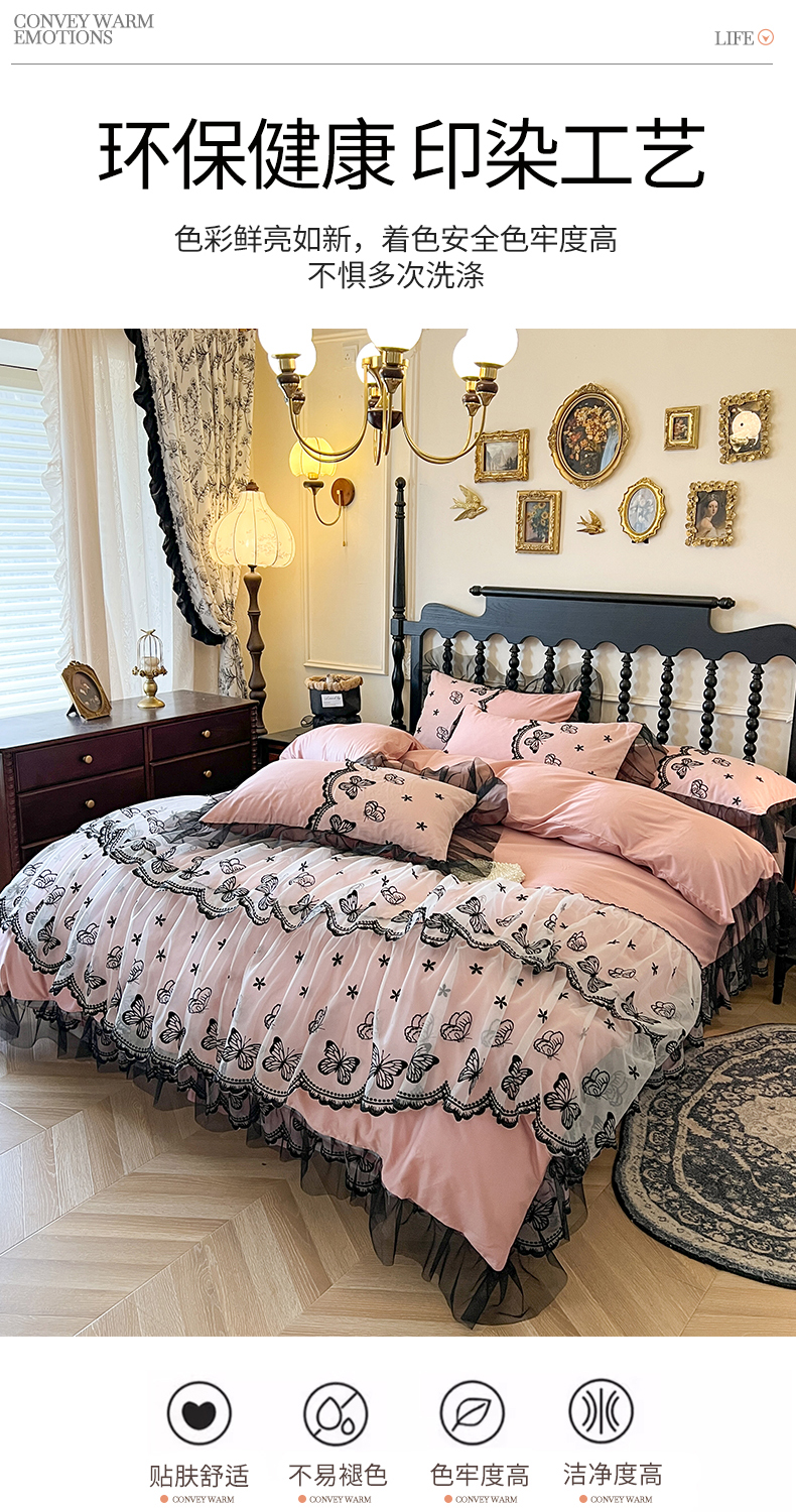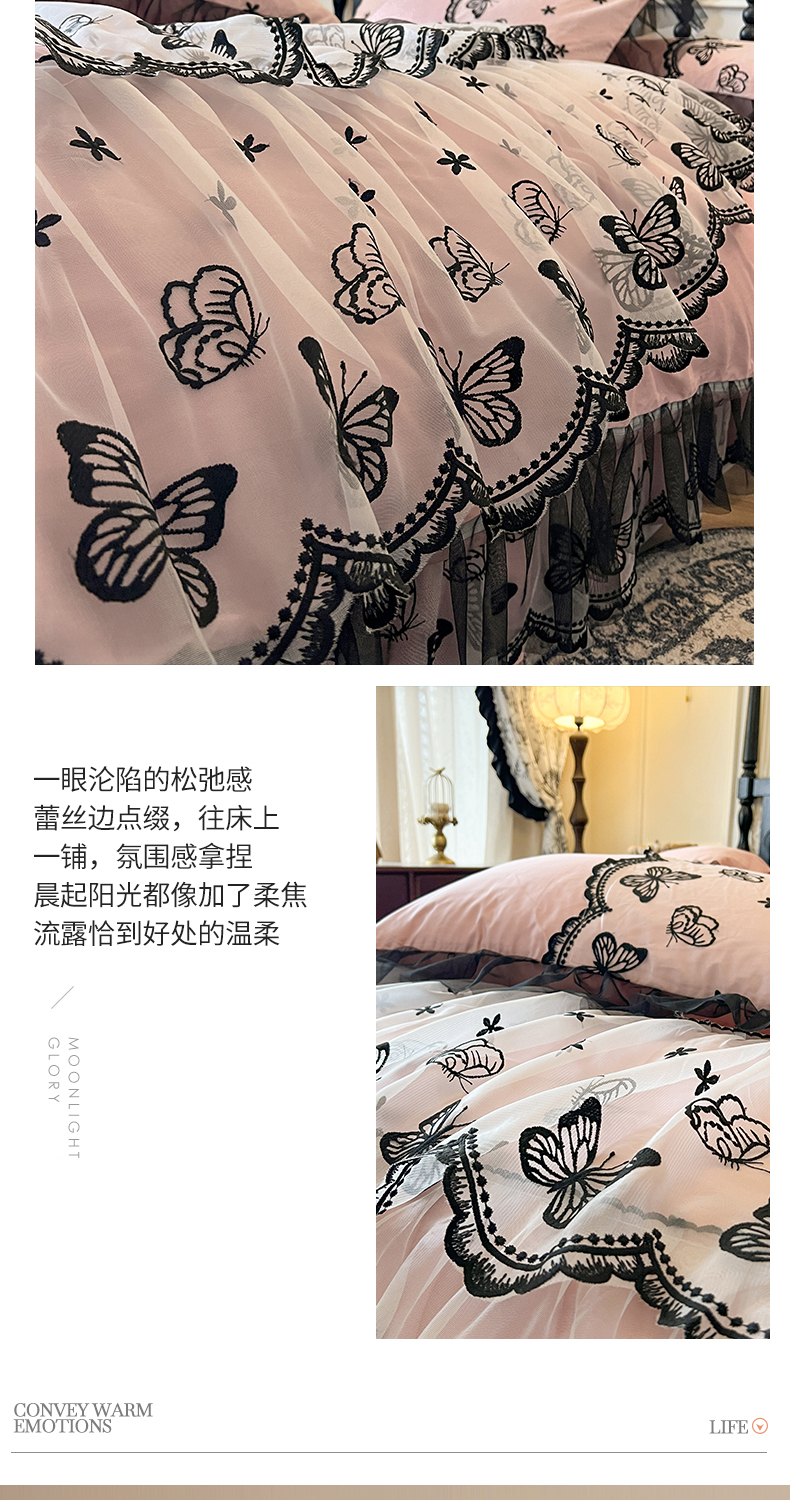 当前位置: 91家纺网 > 商品网购 > 床品套件 > 四件套 > 全棉普通四件套 > 网红馆(ck家纺) 2025新款全棉纯棉蕾丝边床裙款四件套-梦蝶轻舞 梦蝶轻舞-豆沙