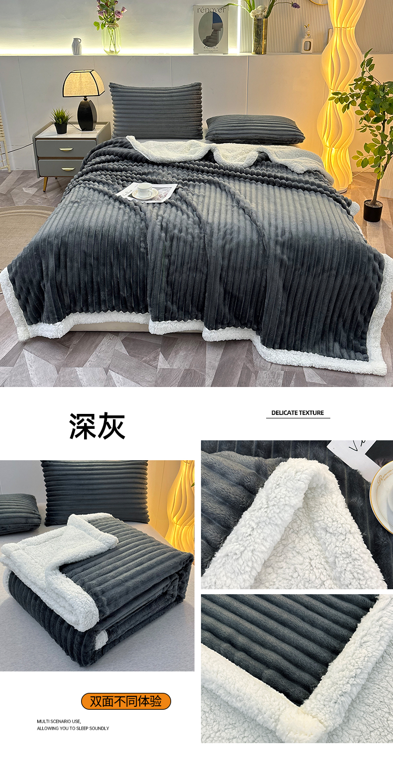 商品名称:枋梢家纺 2025新款仿兔毛绒大抽条羊羔绒毛毯反包双层条纹羊羔绒法兰绒毛毯跨境外贸 深灰