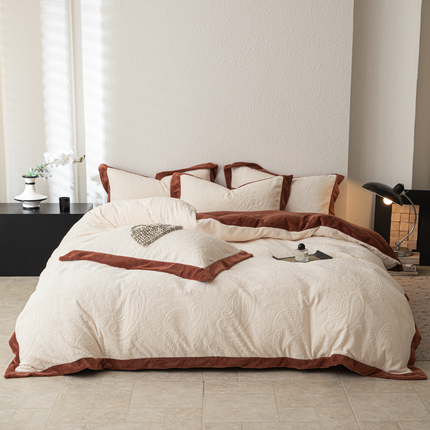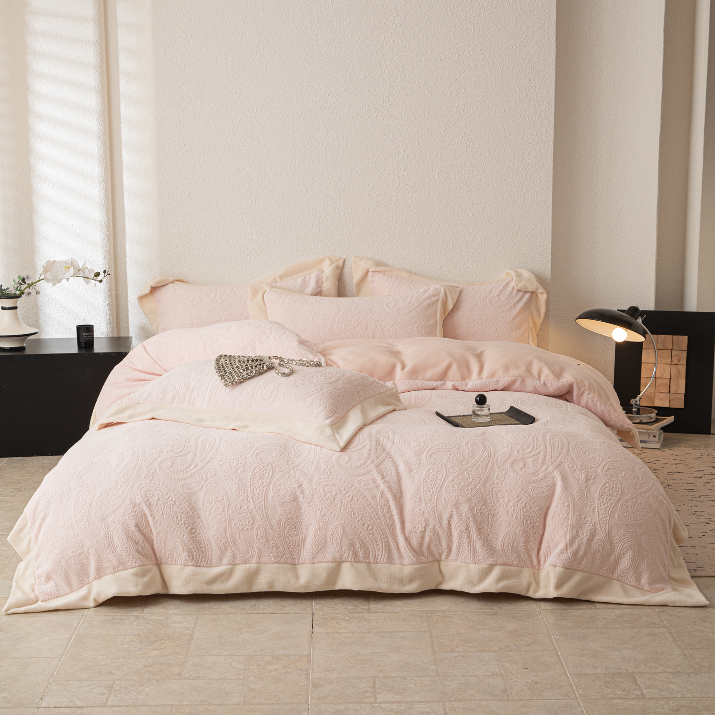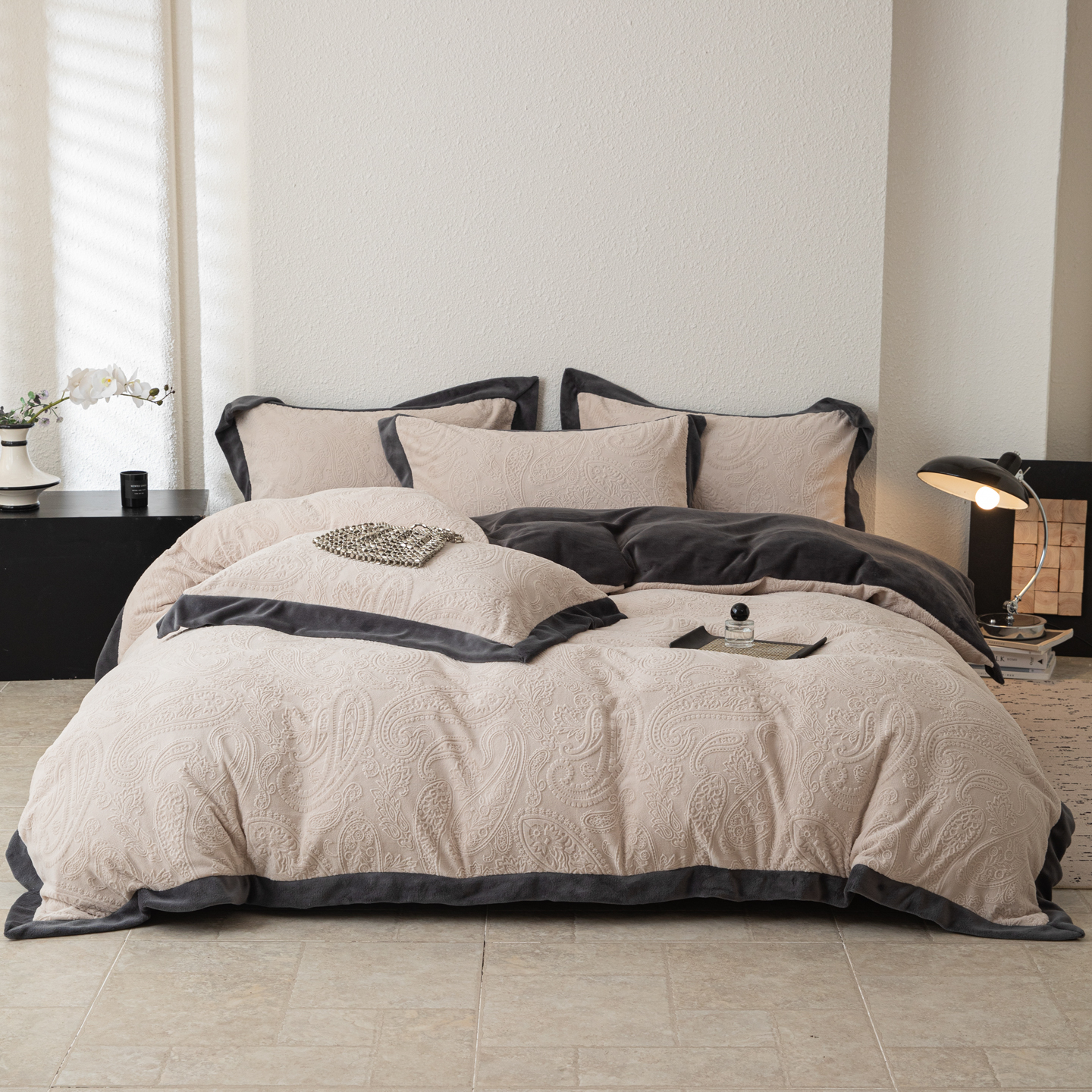 商品名称:若未家居 LOVEWE HOUSE 2025新款240克全消光雕花撞色牛奶绒 四件套-佩斯利 佩斯利 米灰色