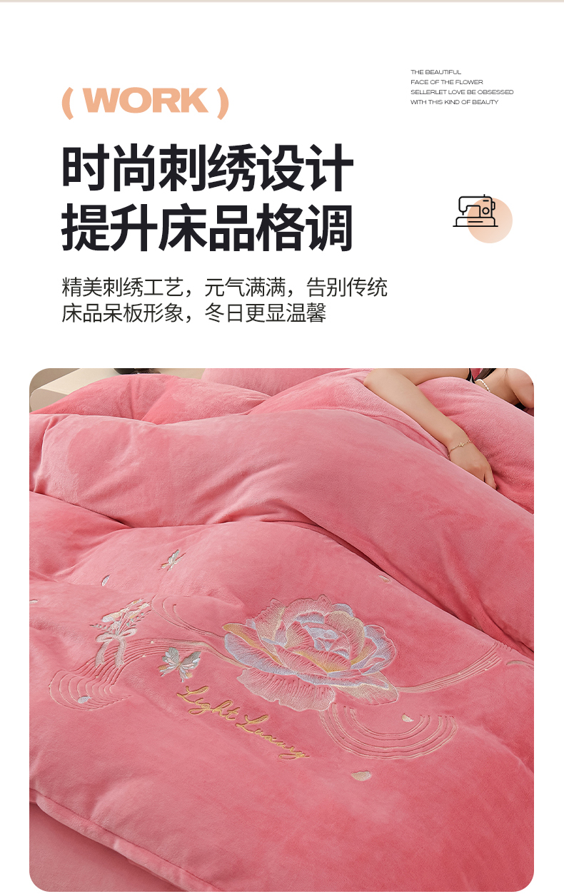 绒小宣 2025新款高克重牛奶绒刺绣四件套 花开富贵-粉,花开富贵-粉