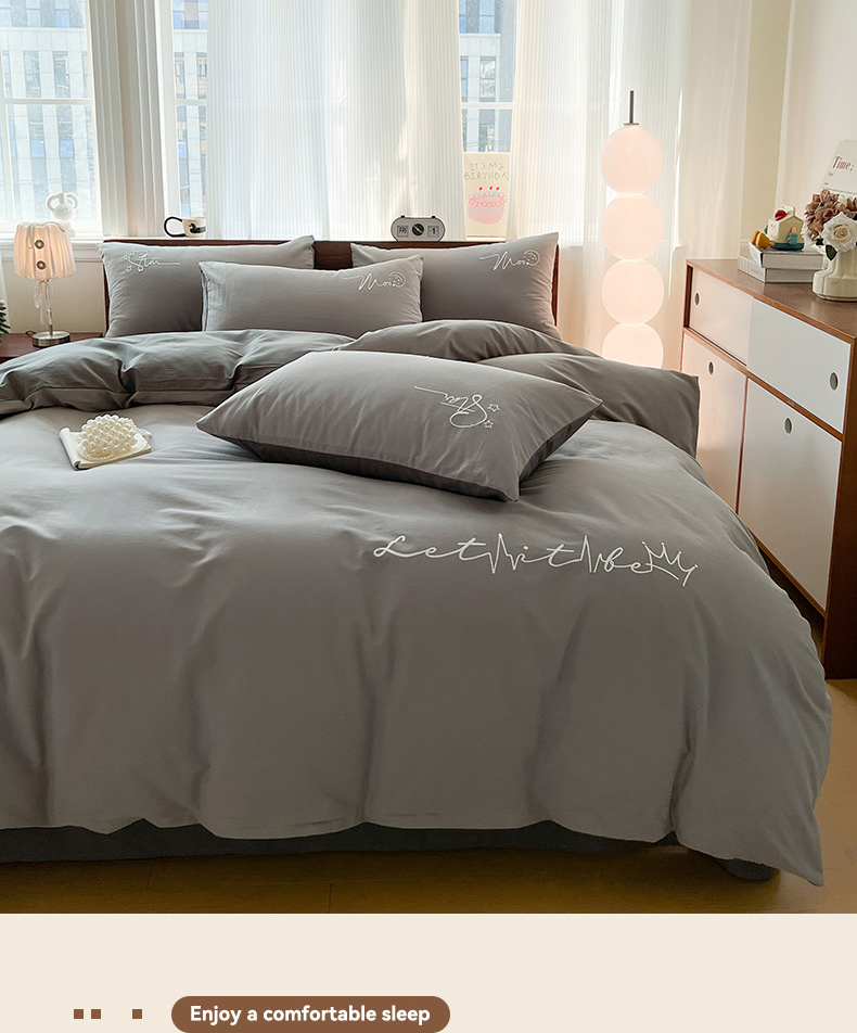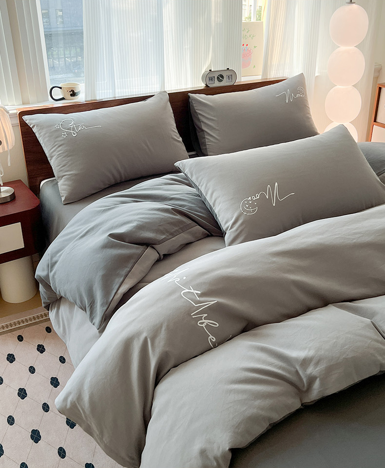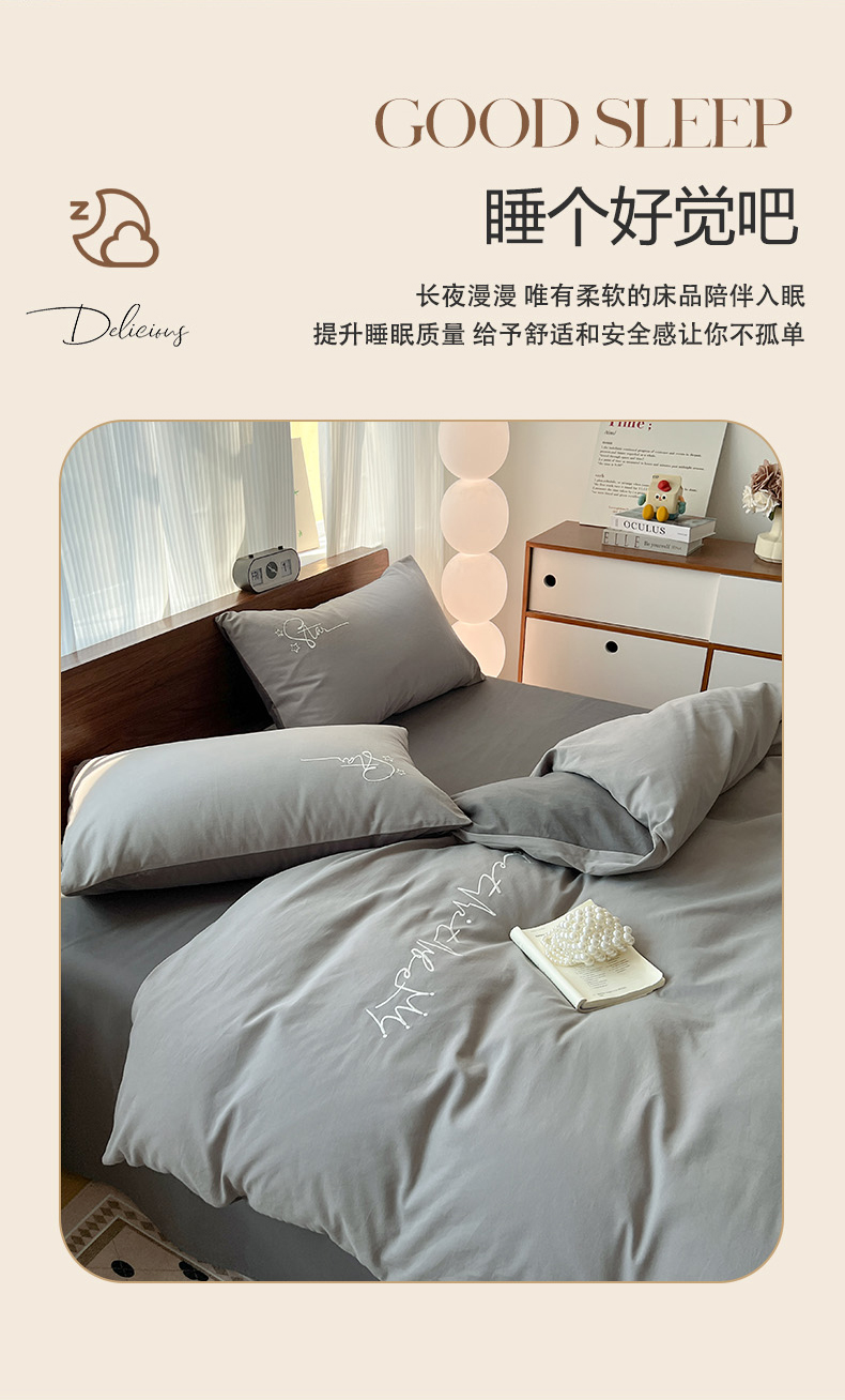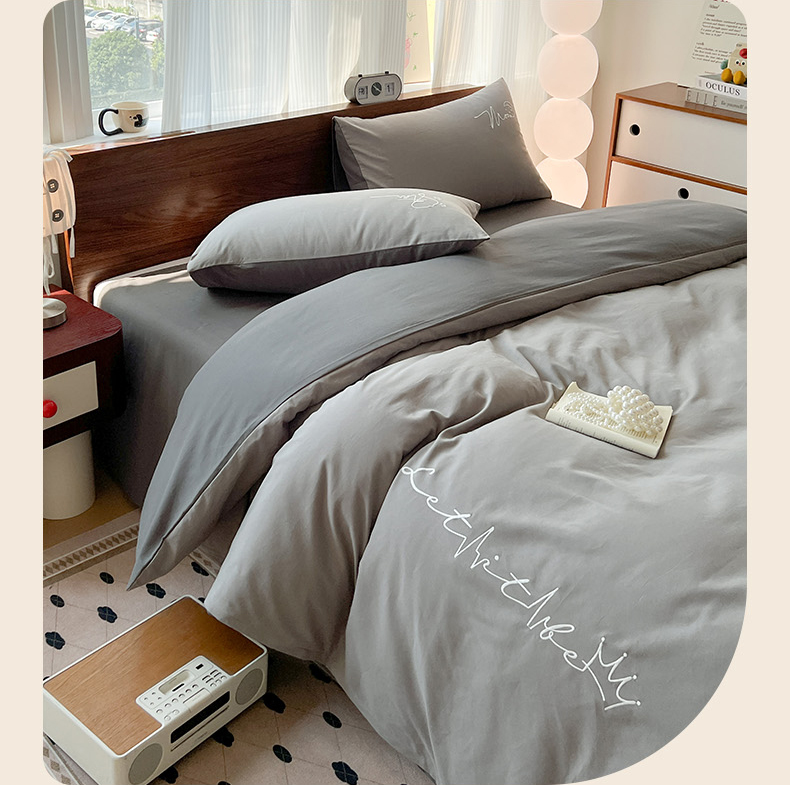 商品名称:有点武功 2025冬季新款百分百全棉磨毛纯色双拼刺绣四件套小清新风 浅灰