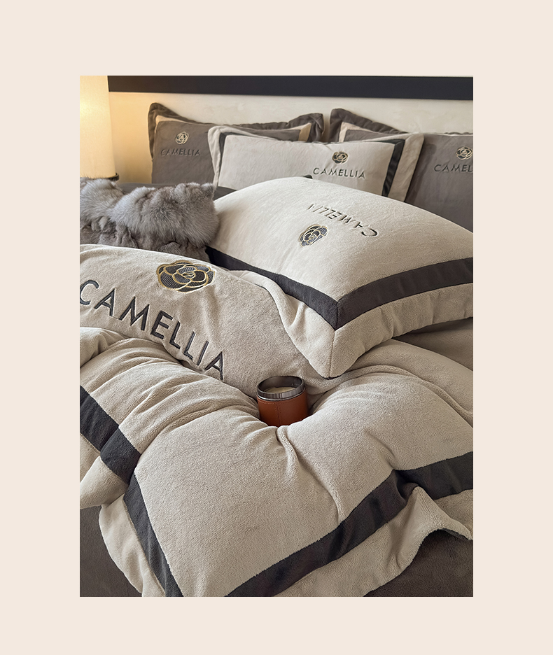 水云缦 2025新款双拼角牛奶绒绣花四件套系列 浅灰-茶褐色