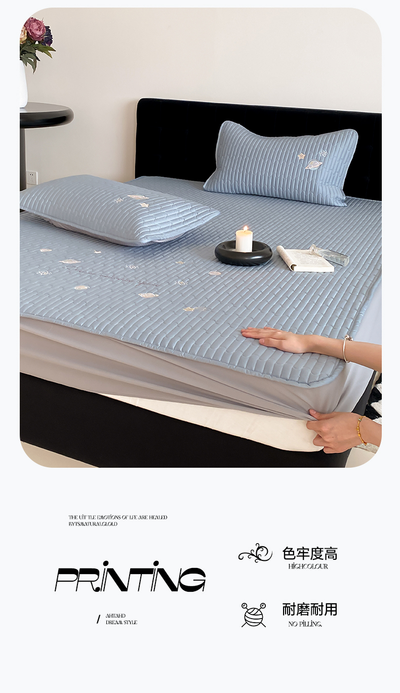 咏绒家纺工厂店 2025新品50S双股全棉长绒棉刺绣绗缝夹棉床笠床垫保护罩三件套 奶茶咖