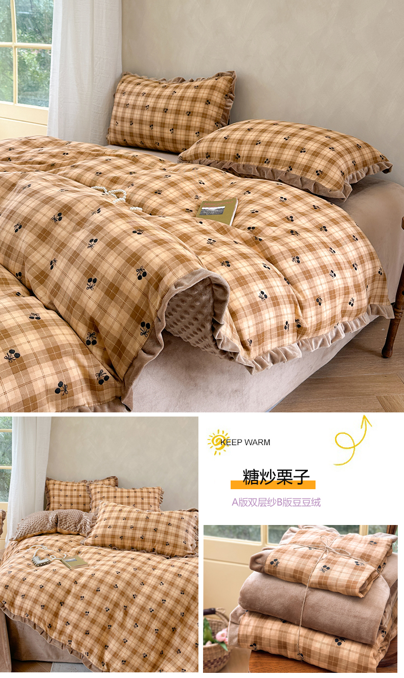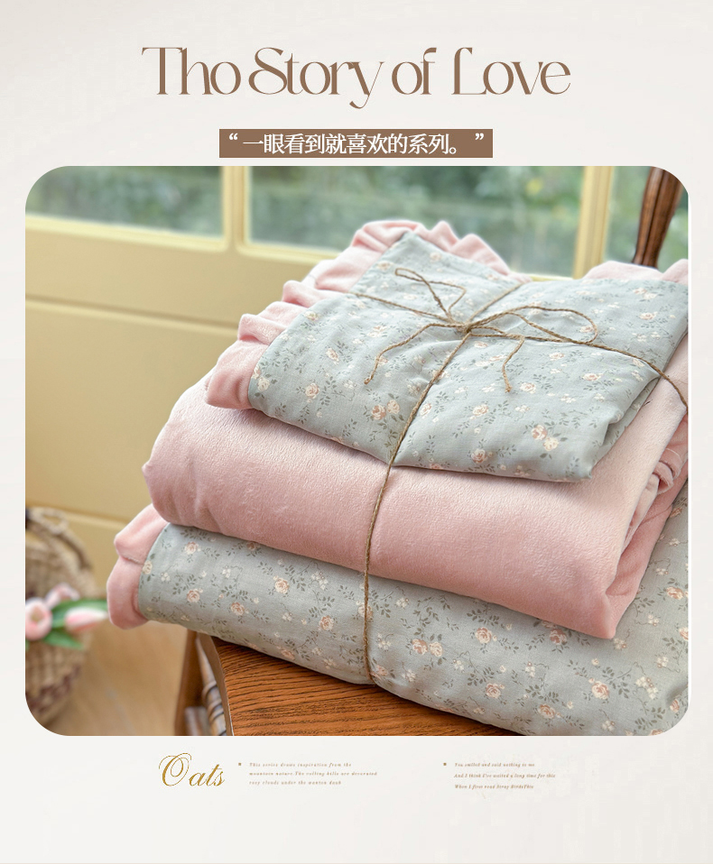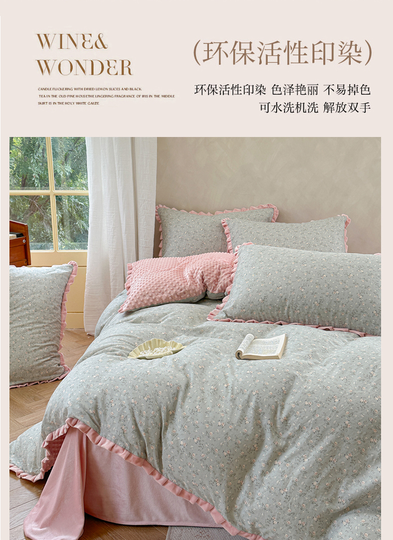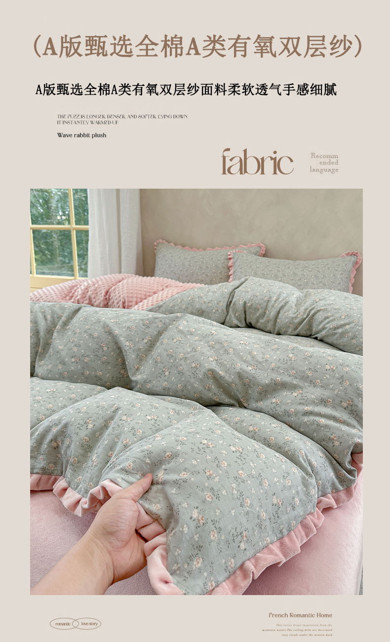 当前位置: 91家纺网 > 商品网购 > 床品套件 > 四件套 > 全棉普通四件套 > 麦伦家居 2025多功能床品全棉纯棉A类有氧双层纱+豆豆绒四件套荷叶边系列 椿野