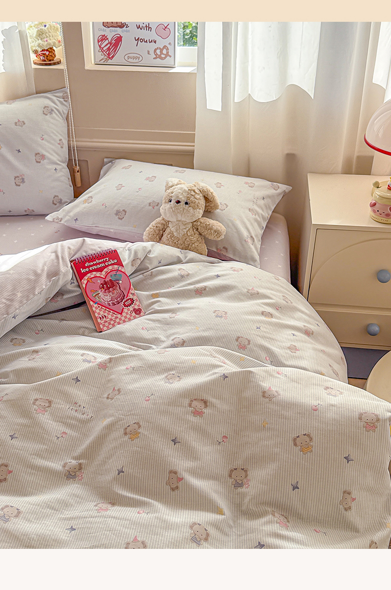 (总)曼之夏 2025新款全棉纯棉40支学生季卡通印花四件套,椰蓝小腊肠,茶茶狗,格子猫,嗨皮狗,开心屋,可爱多,可可汪,玛奇朵,奶昔小熊,泡芙小象,曲奇小狗,趣味熊,甜甜圈,甜心猫咪,童画,小狗日记,樱桃熊仔