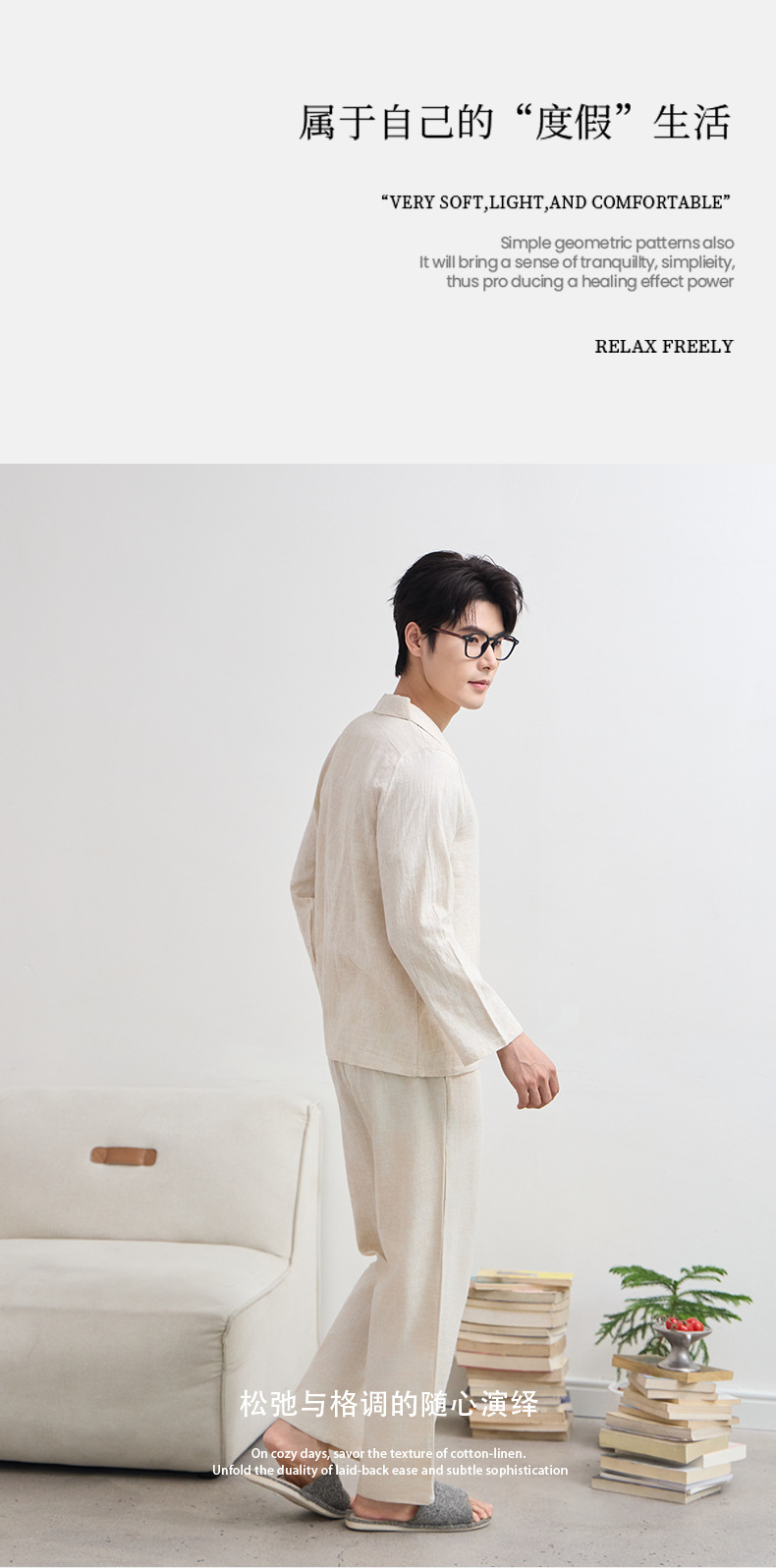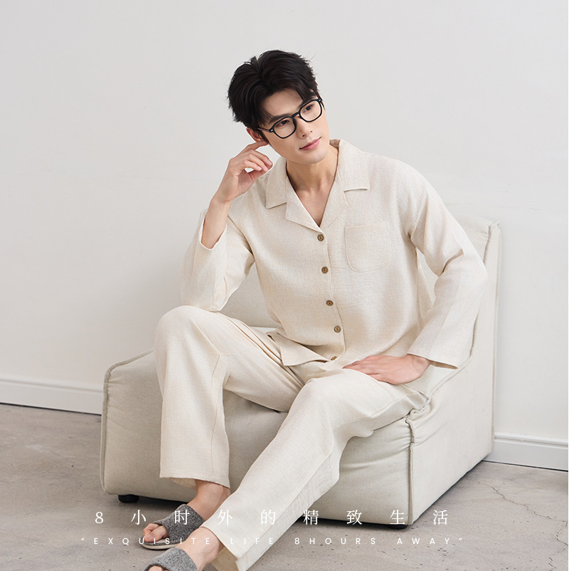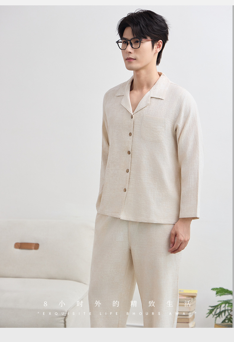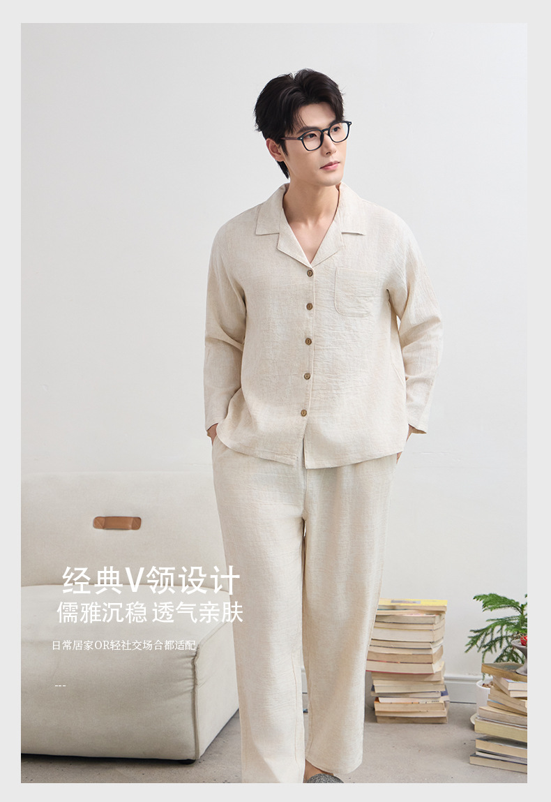 (总)洛兰沙家居馆 2025新款日系无印风色织纯棉双层纱布家居服男士春秋夏季全棉长袖睡衣批发,无印风男