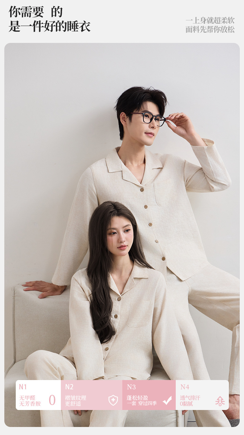 (总)洛兰沙家居馆 2025新款简约纯色棉麻睡衣情侣款春秋夏季薄款男女士家居服套装可外穿长袖