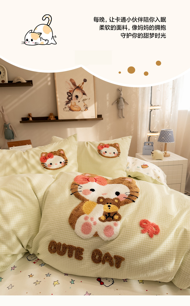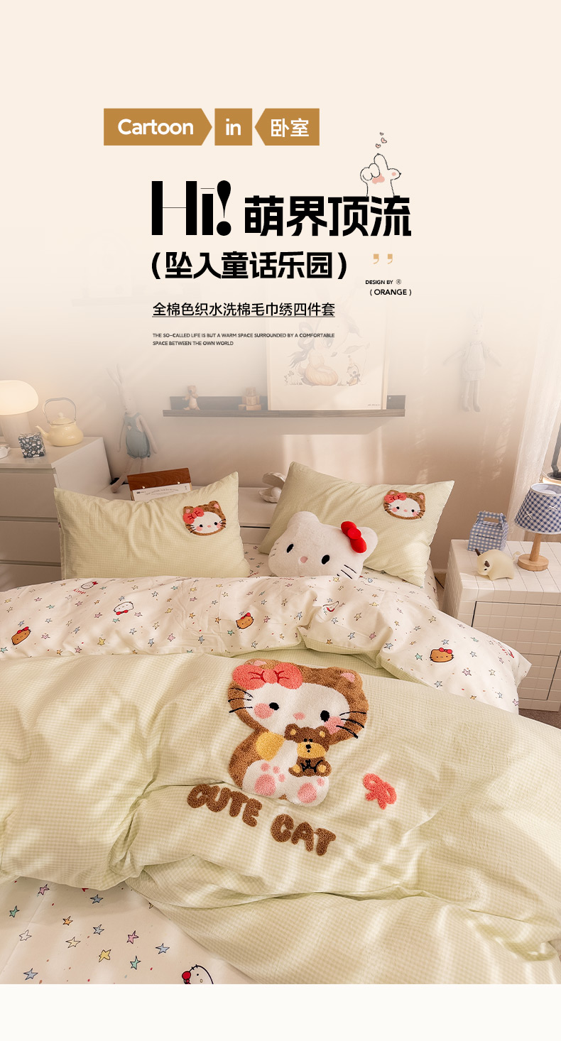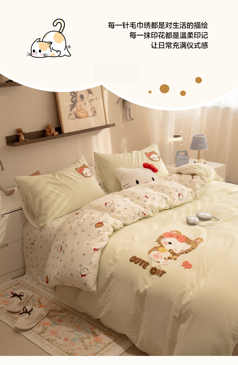 (总)雅居纺家纺 2026新款全棉色织水洗棉毛巾绣猫咪四件套,绿格猫咪,木马猫咪,派对小猫,气球猫咪,星星猫咪,幸福猫咪