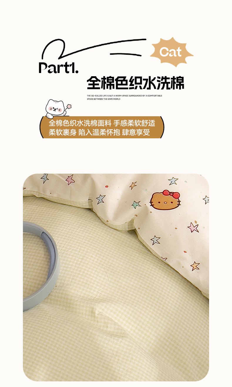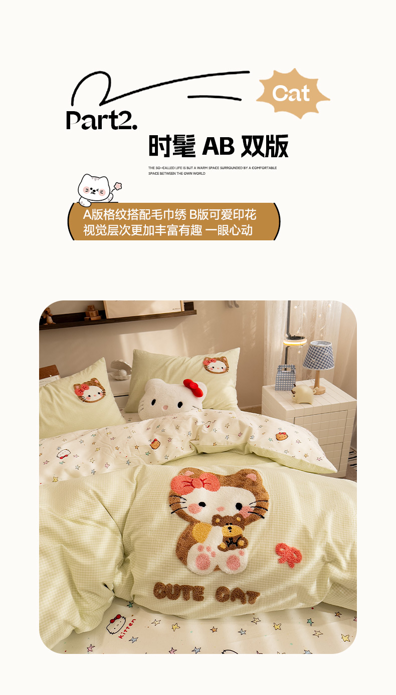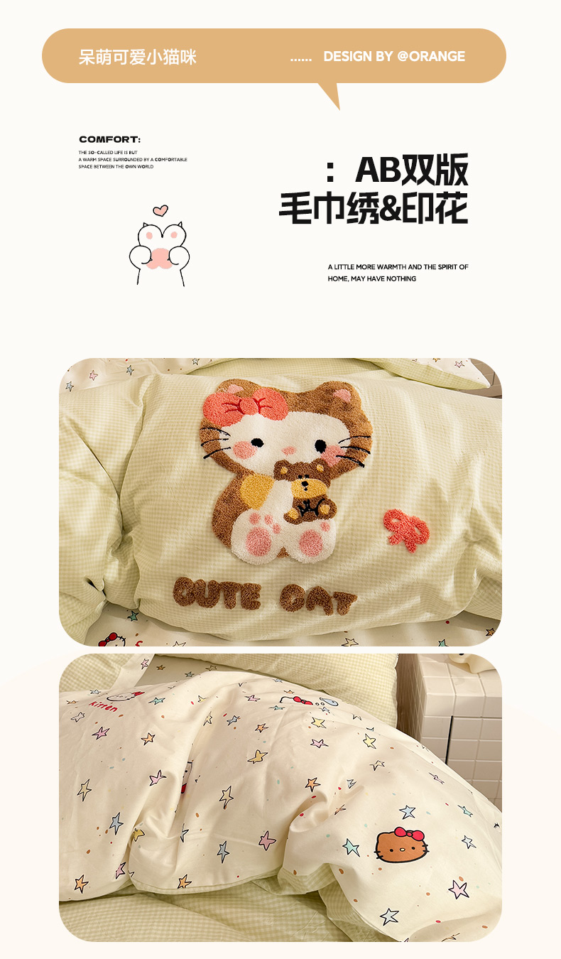 (总)雅居纺家纺 2026新款全棉色织水洗棉毛巾绣猫咪四件套,绿格猫咪,木马猫咪,派对小猫,气球猫咪,星星猫咪,幸福猫咪