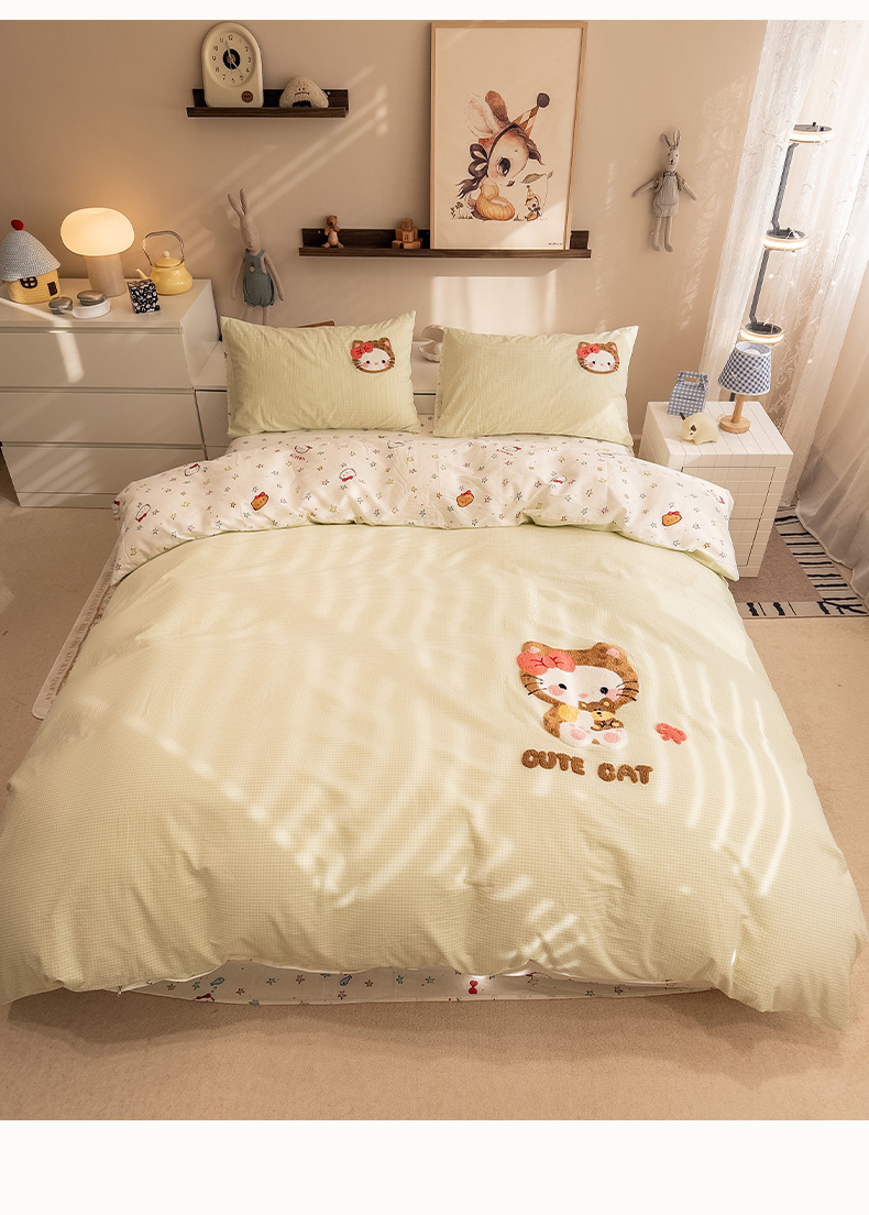 商品名称:雅居纺家纺 2026新款全棉色织水洗棉毛巾绣猫咪四件套 绿格猫咪