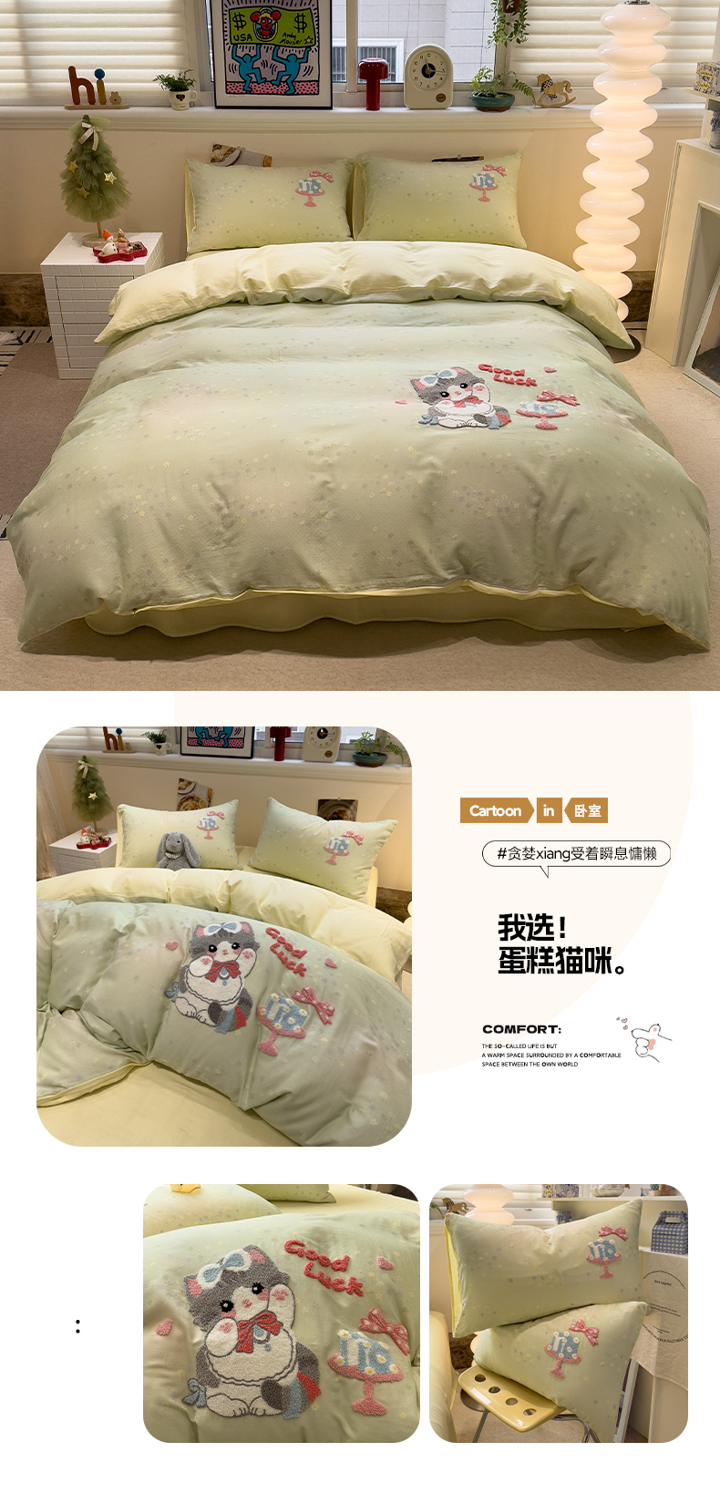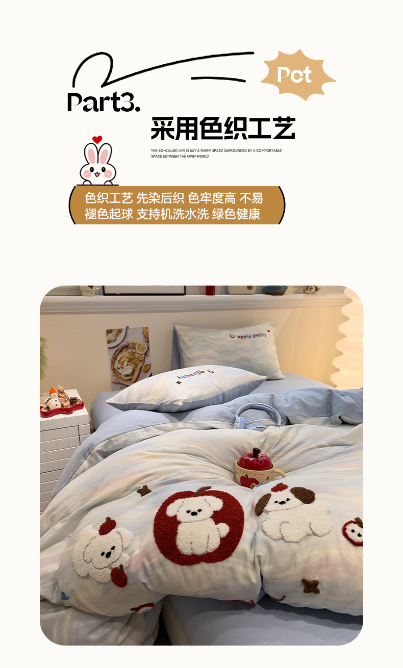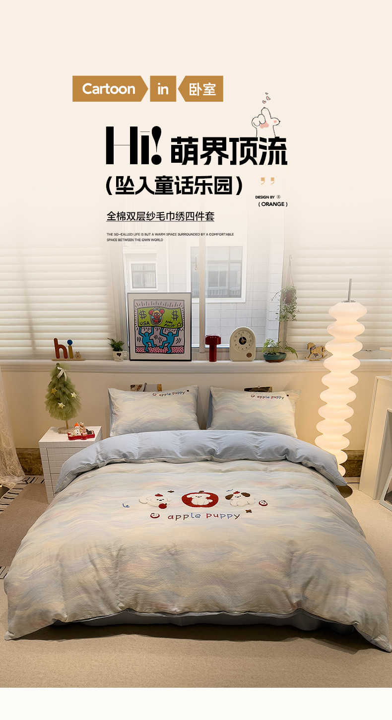 (总)雅居纺家纺 2026新款全棉双层纱毛巾绣四件套,蛋糕猫咪,红苹果小狗,萌宠甜品,早安兔兔