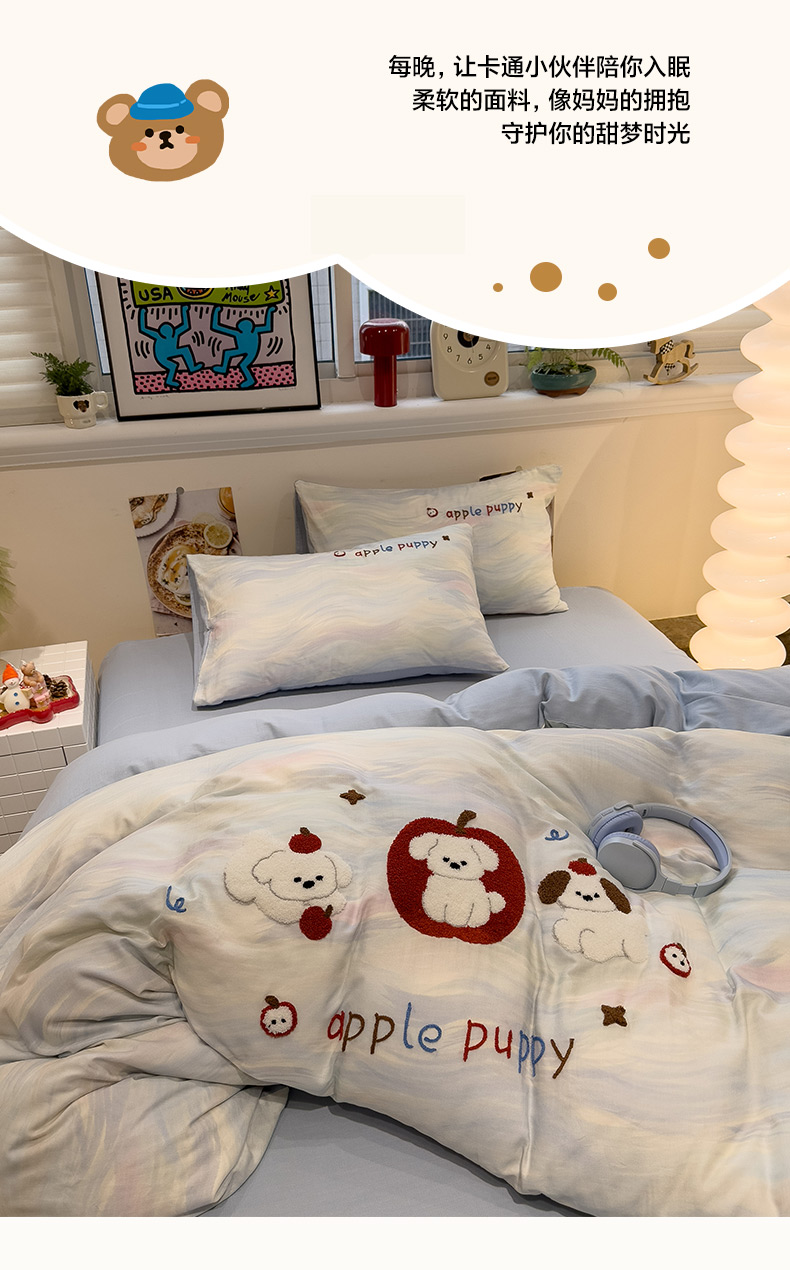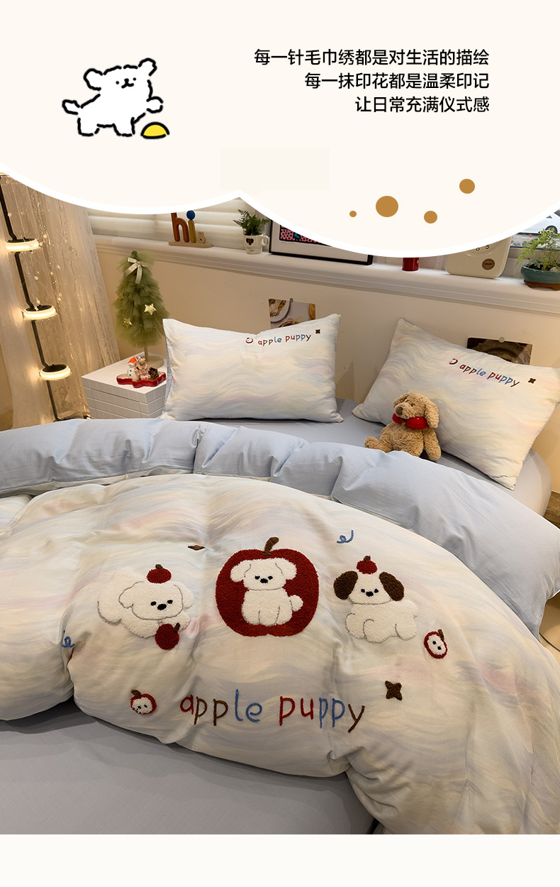 雅居纺家纺 2026新款全棉双层纱毛巾绣四件套 红苹果小狗