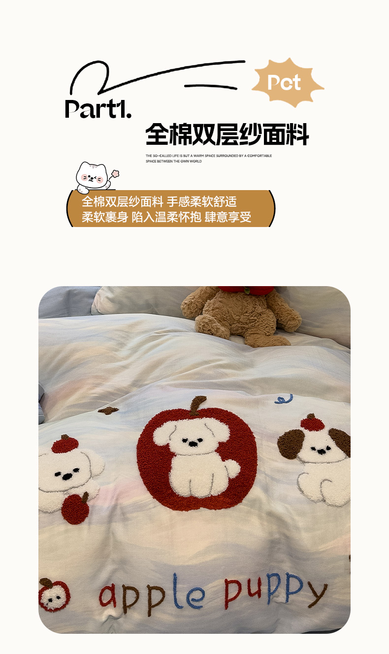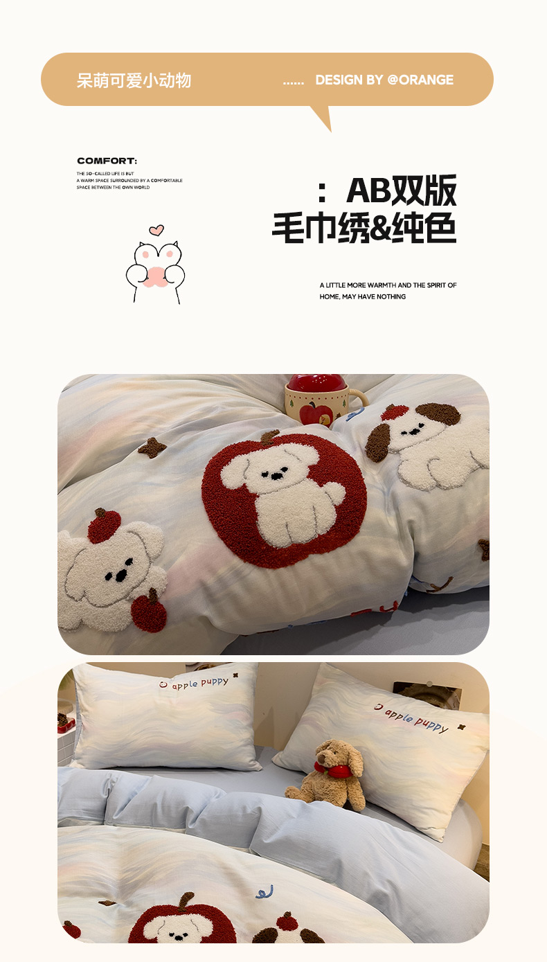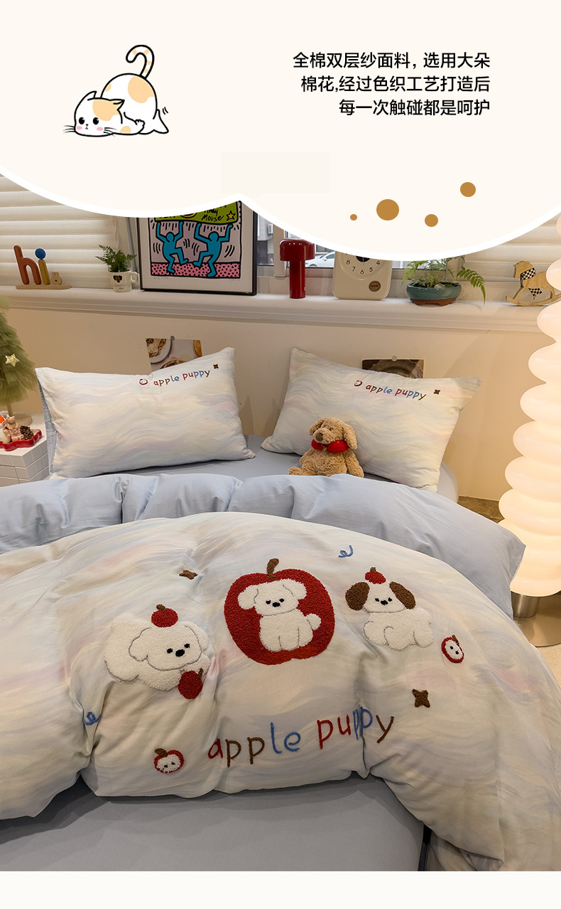 商品名称:雅居纺家纺 2026新款全棉双层纱毛巾绣四件套 红苹果小狗