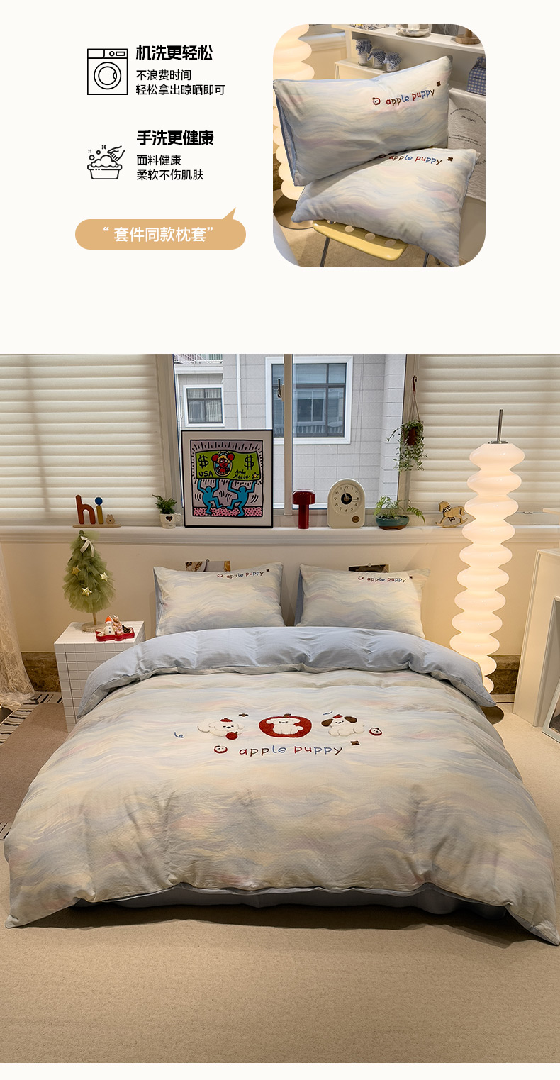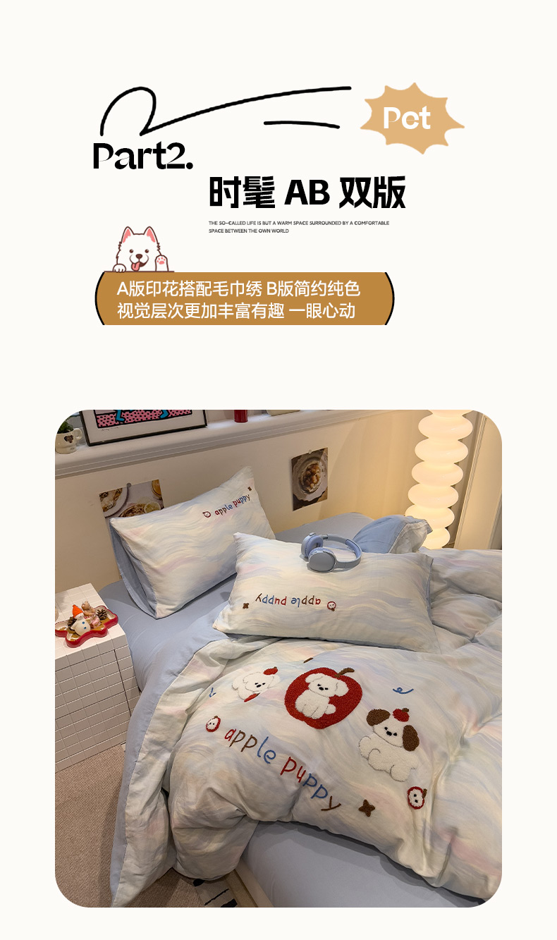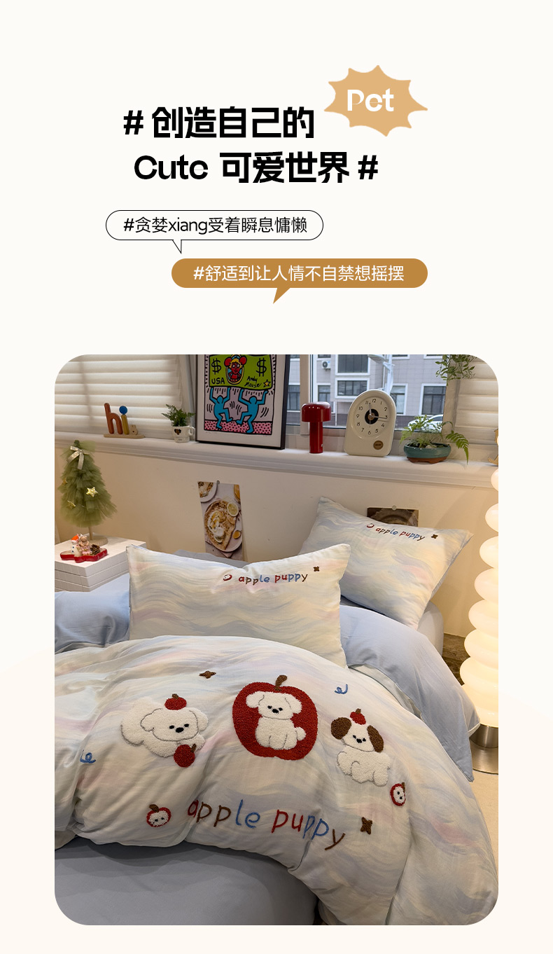 商品名称:雅居纺家纺 2026新款全棉双层纱毛巾绣四件套 红苹果小狗