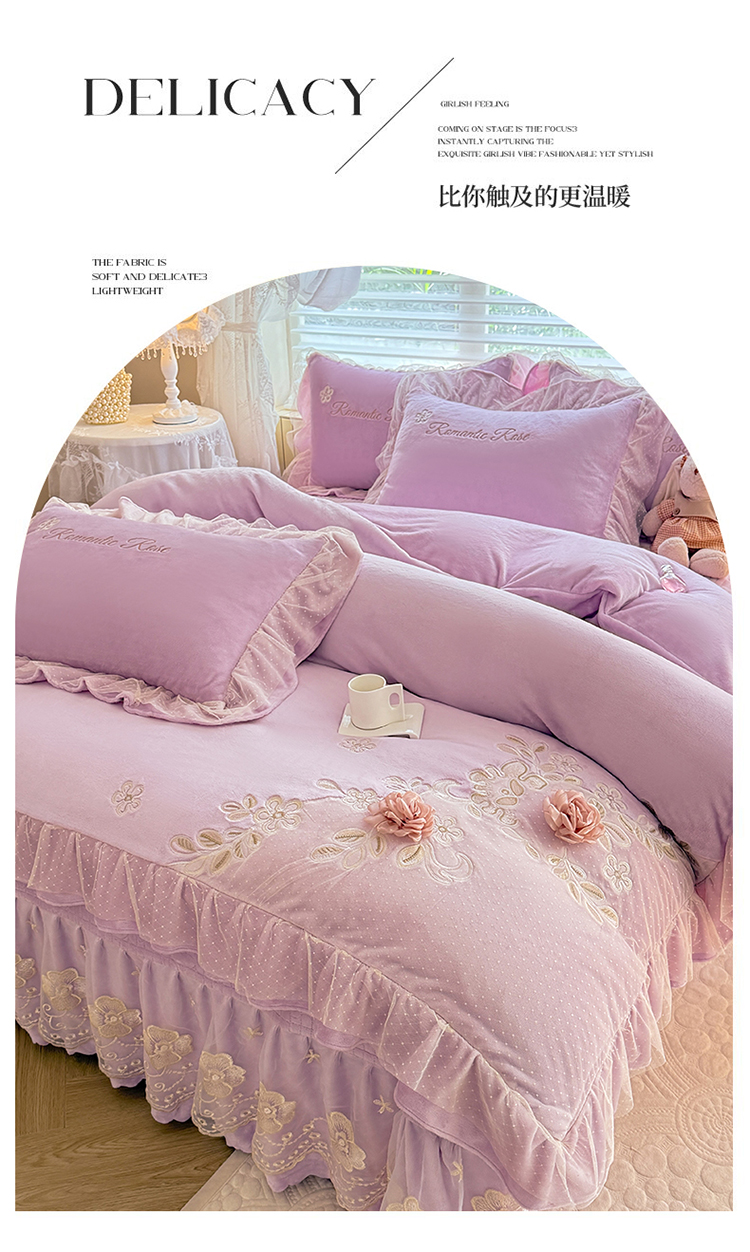 (总)漫布云 2025新款230g高克重韩版立体盘花牛奶蚕丝绒绣花四件套床裙款被套-洛丽塔系列,洛丽塔-嫩黄 ,洛丽塔-香芋紫,洛丽塔-珍珠粉, 洛丽塔-婴儿蓝