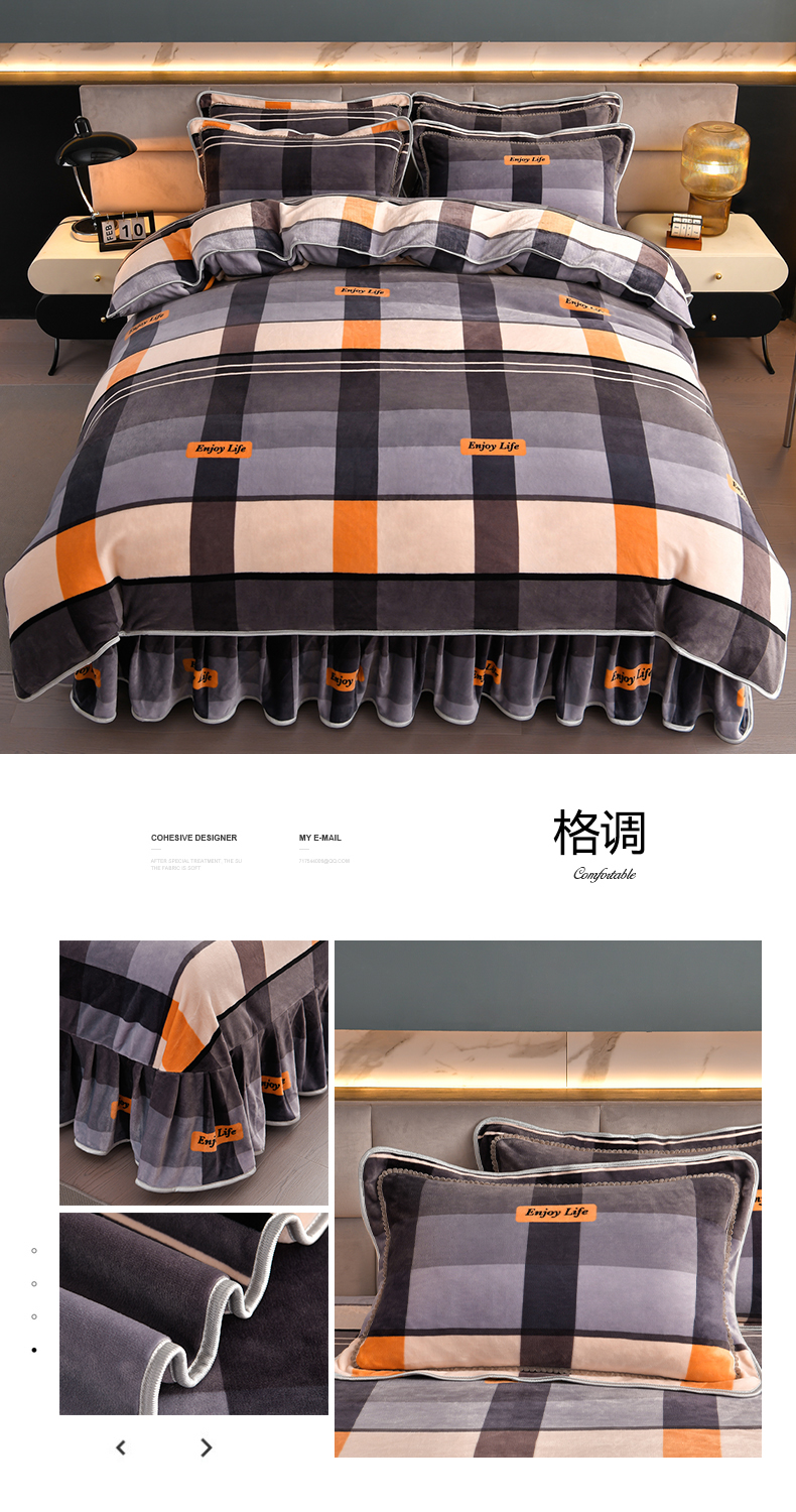 商品名称:董成龙家纺 20256新款高克重9-10斤加厚印花超柔牛奶绒爆款法莱绒金貂绒床裙四件套控价 格调