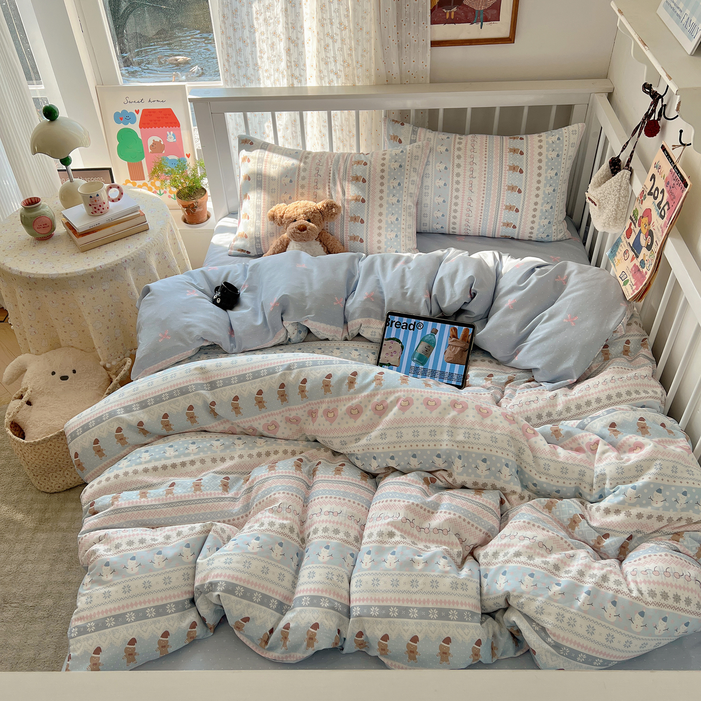 (总)桃喜 2026新款全棉混搭卡通印花学生三件套四件套,费尔岛蝴蝶结小狗,费尔岛小熊,可爱动物团,可爱小兔子,星星猫咪