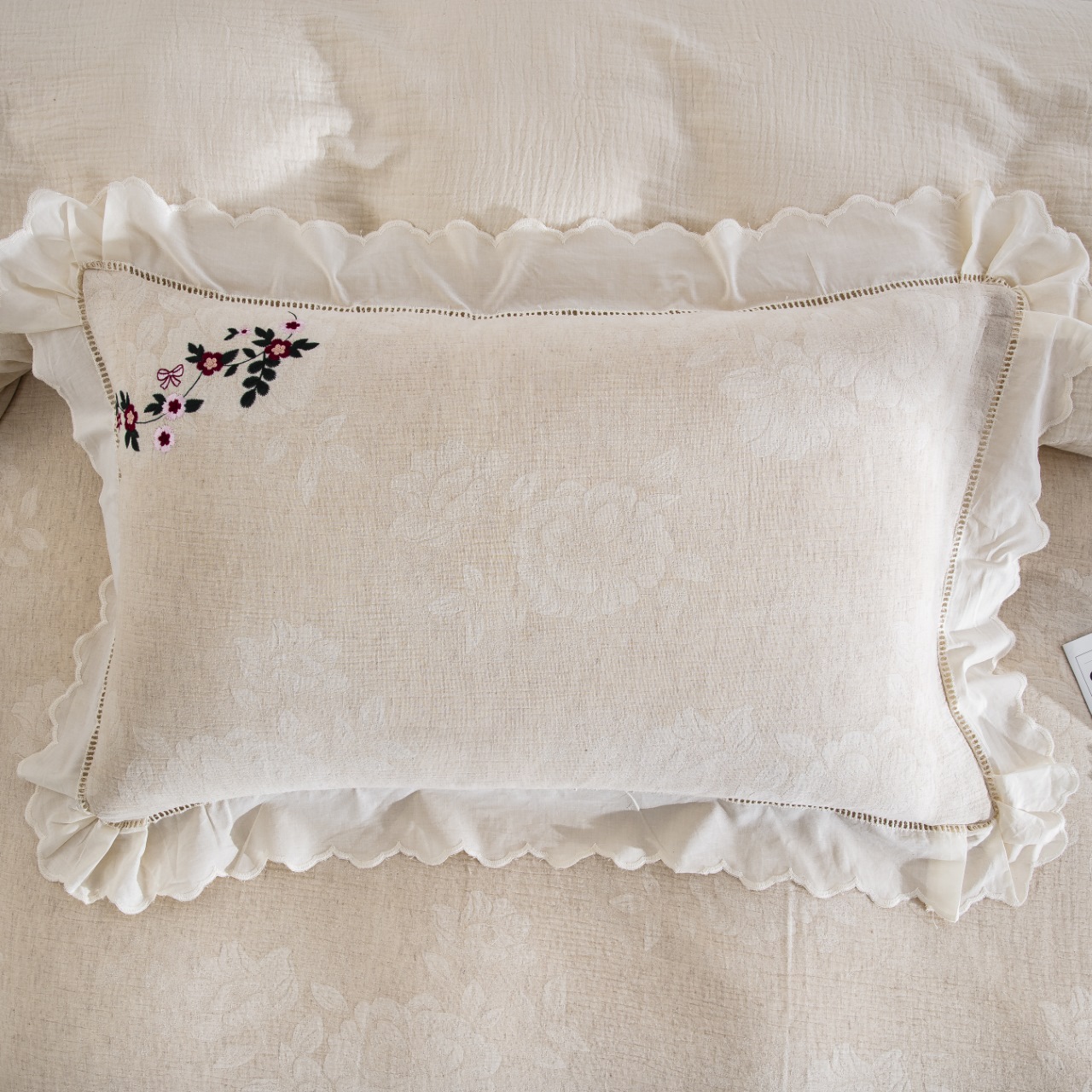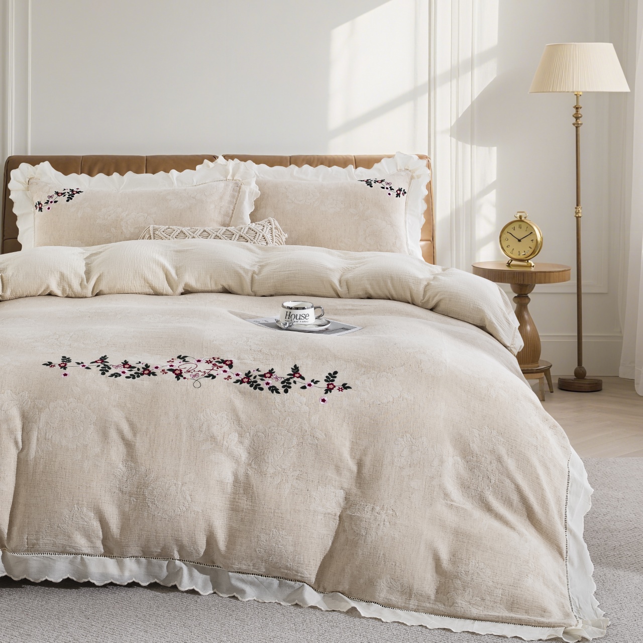 商品名称:双层纱家居 2026新款浣溪沙棉麻刺绣花边款四件套 浣溪沙-咖