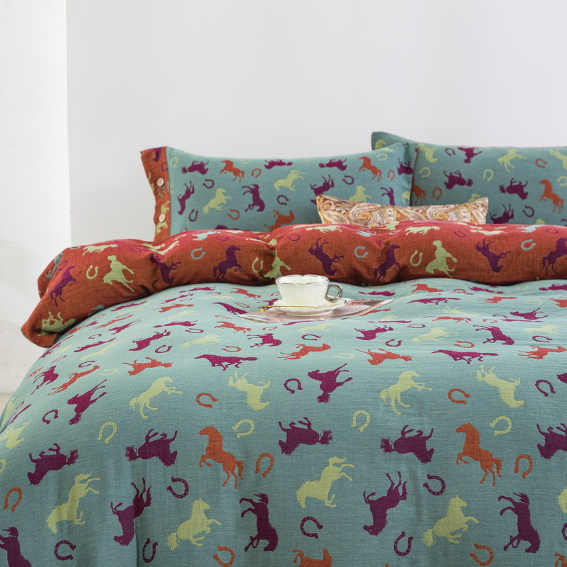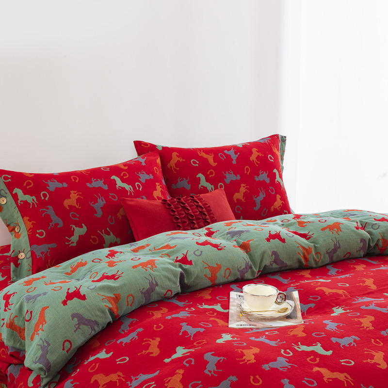 商品名称:双层纱家居 2026新款马上有钱全棉纯棉色织提花双层纱纽扣款四件套 马上有钱-正红