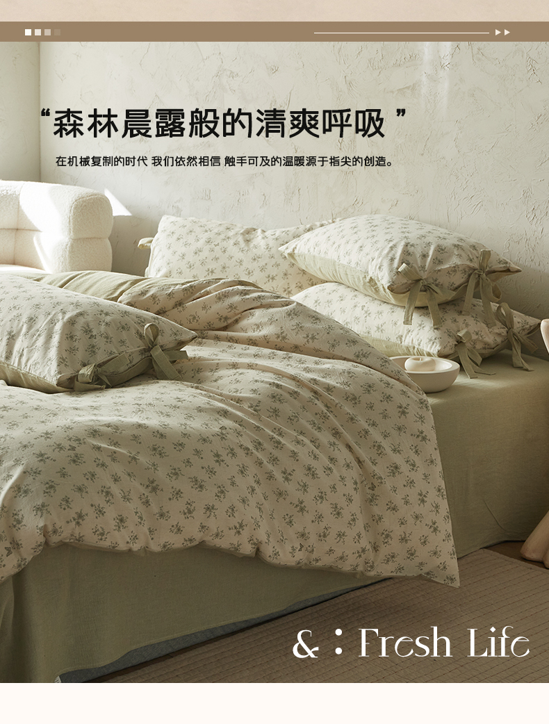 商品名称:绫韵家纺 2026春夏新款A类印花棉麻蝴蝶结四件套 清风蝶鱼·绿