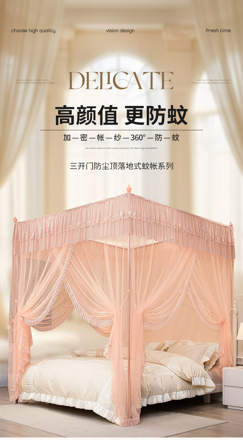 当前位置: 91家纺网 > 商品网购 > 床上用品 > 蚊帐 > 海虹蚊帐 2026新款2603款三开门一体防尘顶落地蚊帐 浅粉