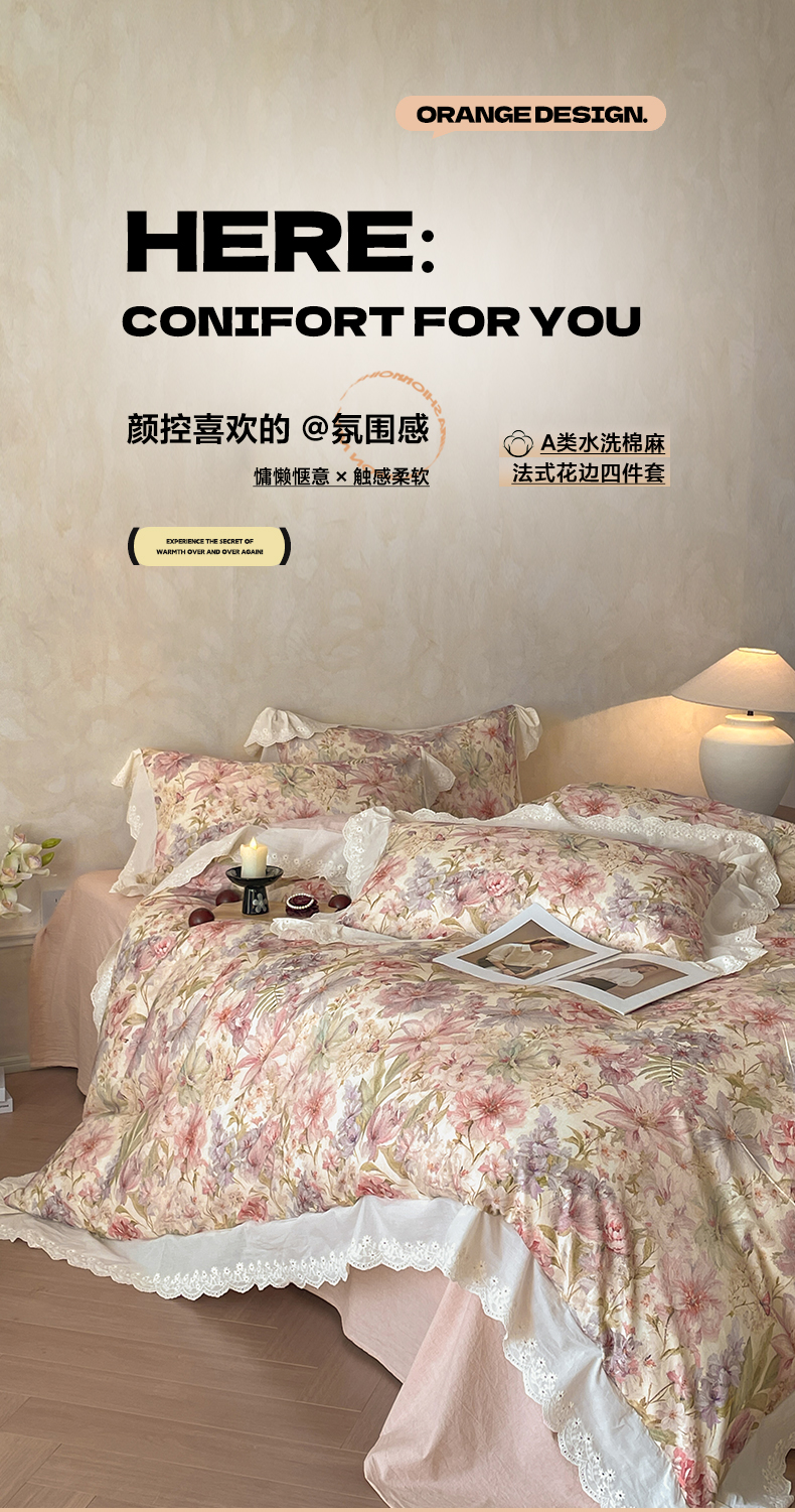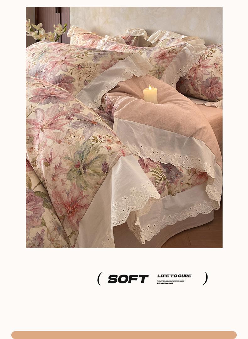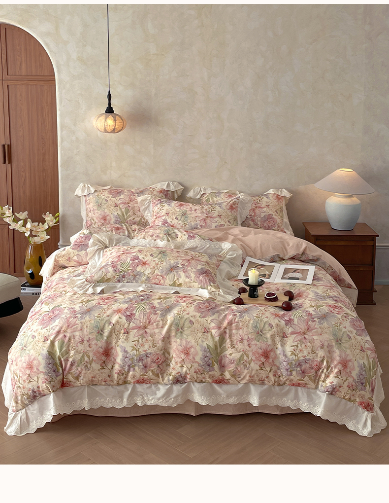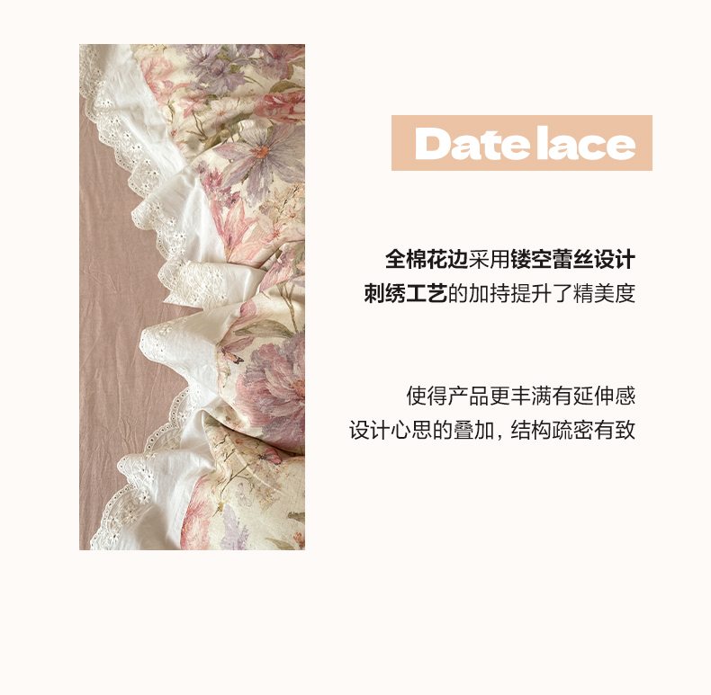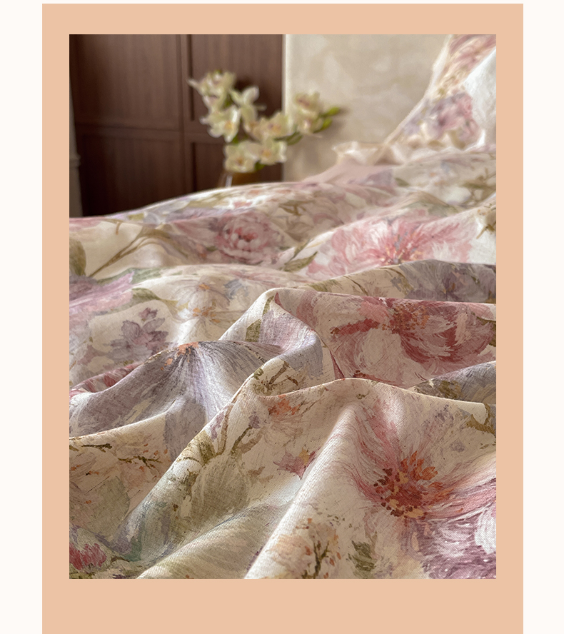 当前位置: 91家纺网 > 商品网购 > 床品套件 > 四件套 > 其它四件套 > 莱登卡奴 2026新款A类棉麻数码印花25%麻75%棉法式复古花边四件套 幻彩雅韵粉