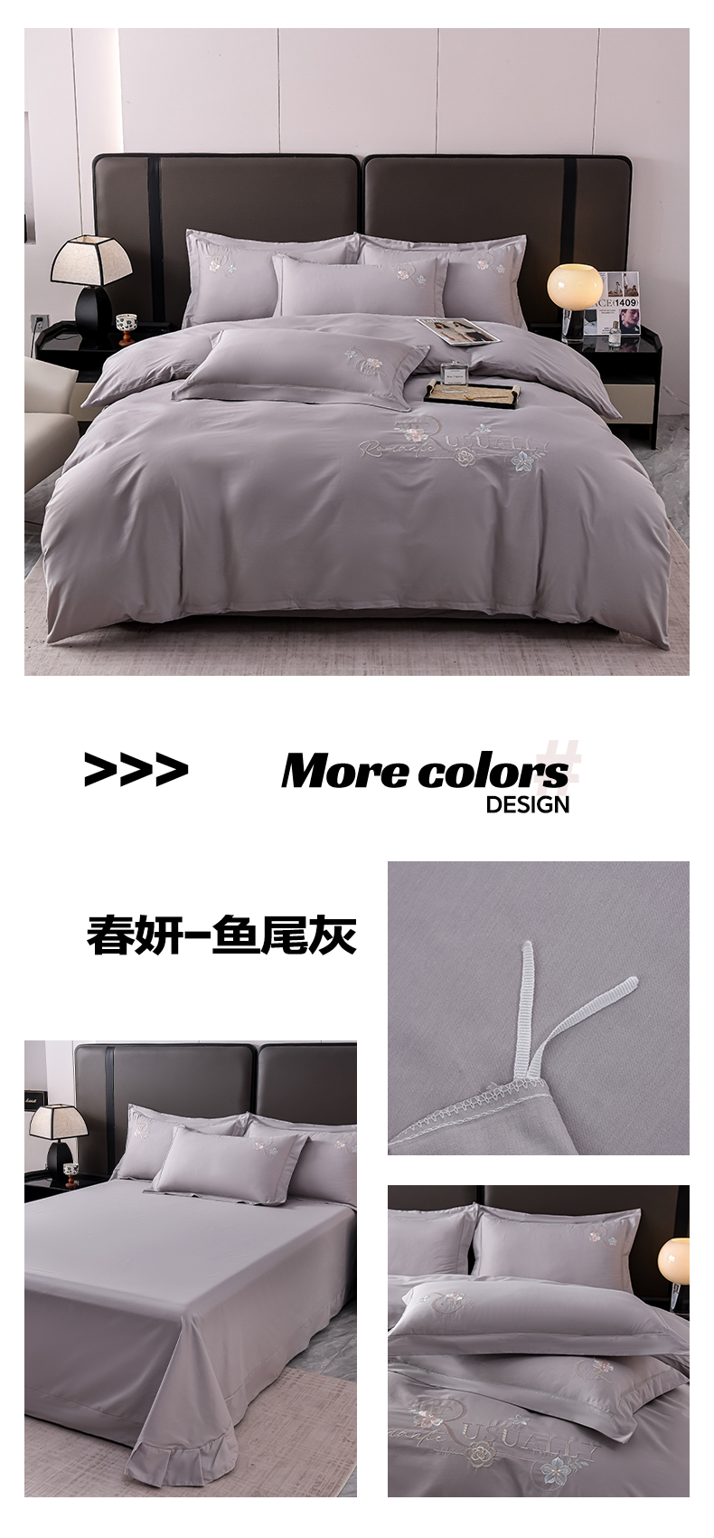 商品名称:森林雨 【素-凝绣】2026新款133x76高精密刺绣100%全棉四件套 春妍-鱼尾灰
