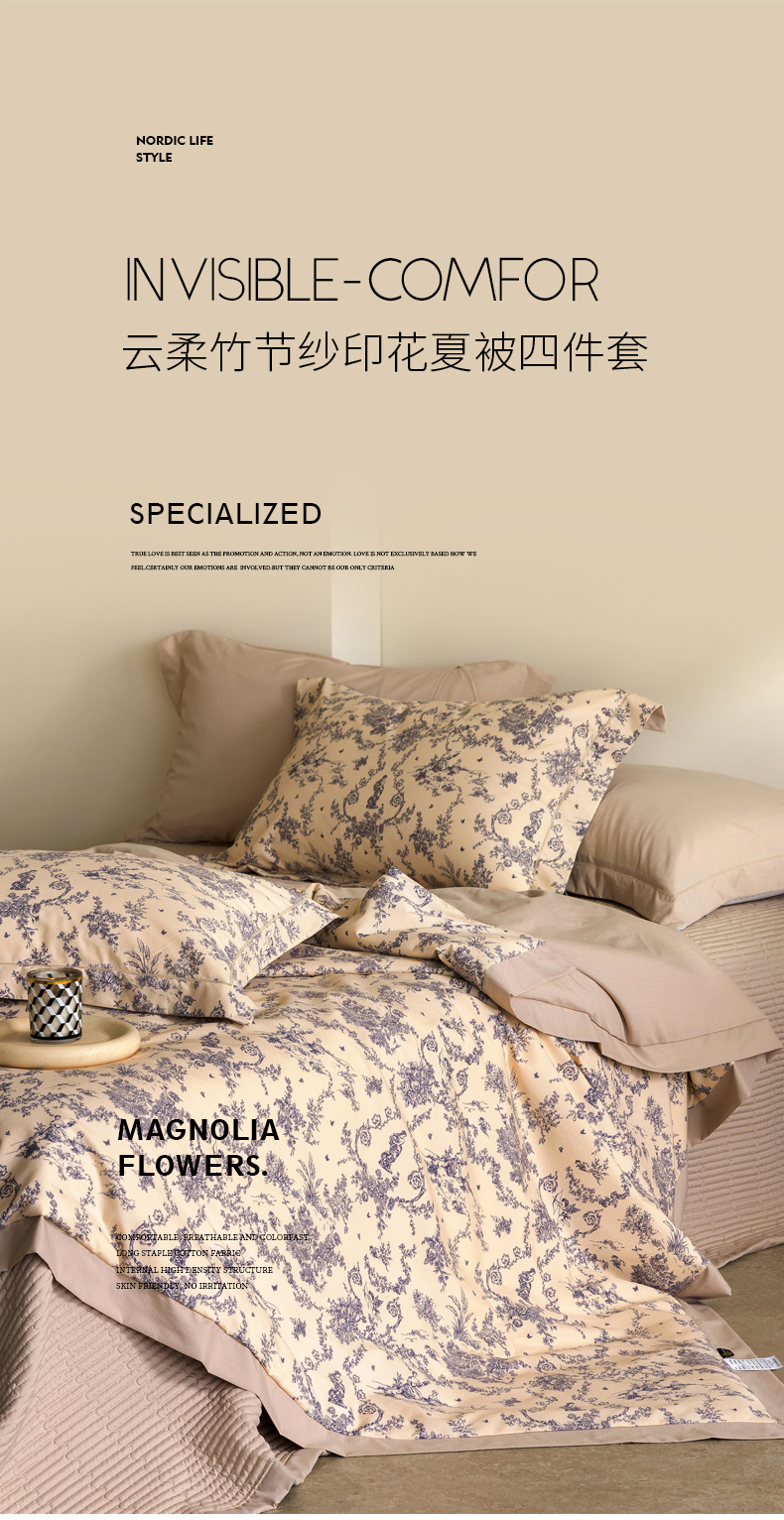 • 91家纺网 家纺一手货源 找家纺 立奥被业 2026新品冰丝棉夏被四件套竹节纱夏被四件套 青藤絮语-咖
