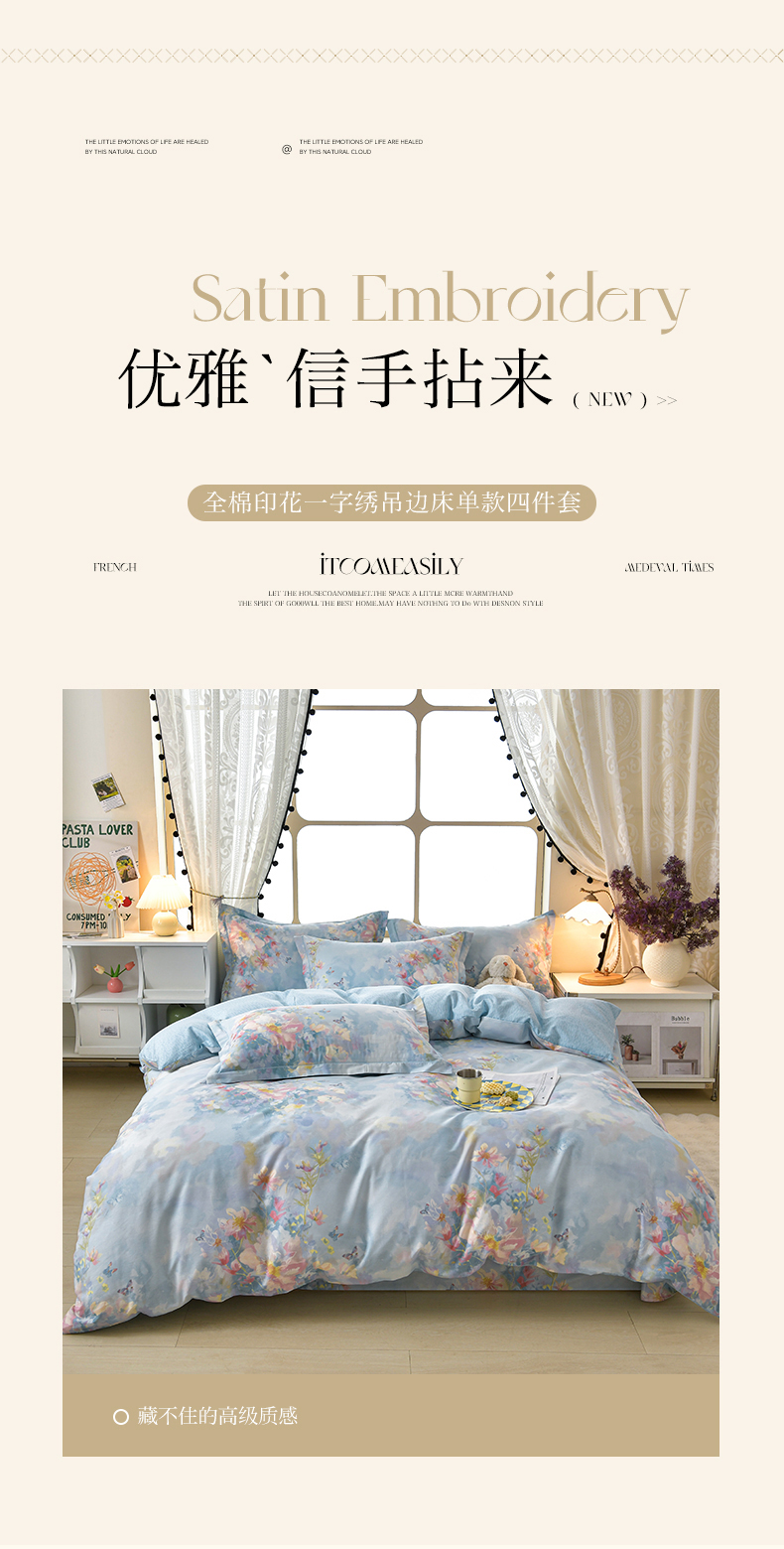 商品名称:绘萱家居 2026直播爆款一字绣吊边款纯棉100%全棉四件套印花百分百(喷气高品质) 水彩花境