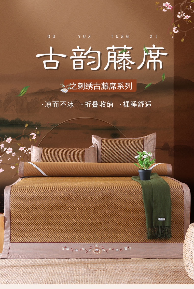 小牛席业 2026新款刺绣古藤席【常规款】藤席凉席冰藤席冰丝席乳胶席 古韵藤席