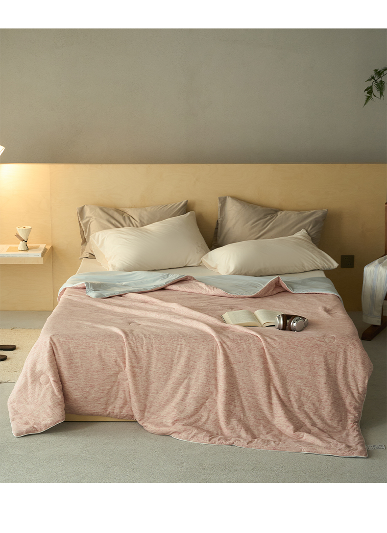 • 91家纺网 家纺一手货源 找家纺 华超针织 2026新款全棉针织拼锦氨凉感夏被空调被夏凉被 纯棉拼凉感 段彩玉粉