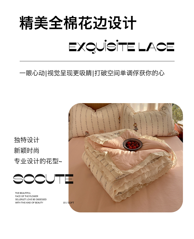 商品名称:梵克保罗 2026春夏新款全棉纯棉花边皱皱纱单夏被夏凉被空调被夏被四件套 墨序花