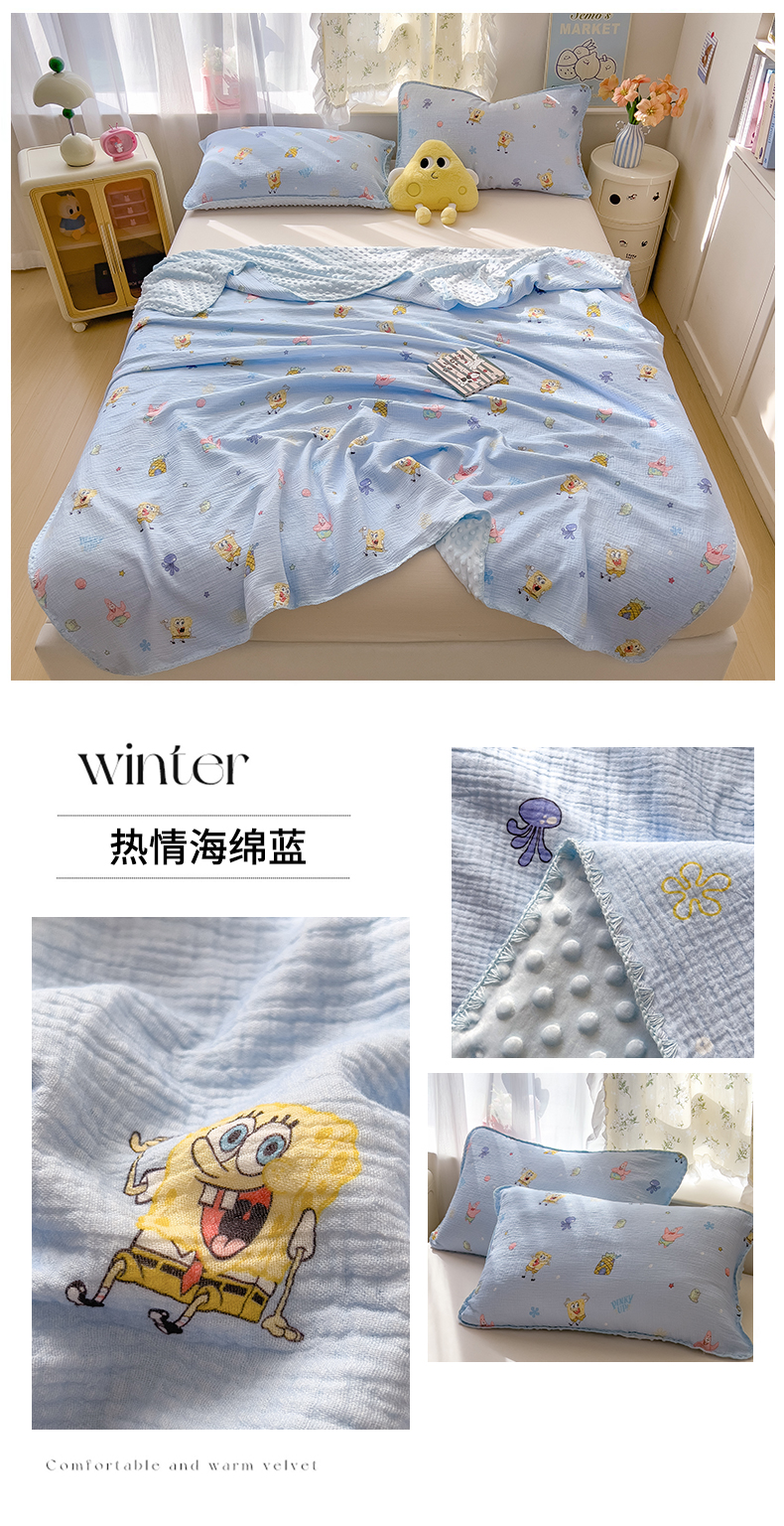 商品名称:兄弟坊 2026新款正版授权卡通全棉双层纱安抚被夏被纱布豆豆毯学校午睡被 无忧海绵黄