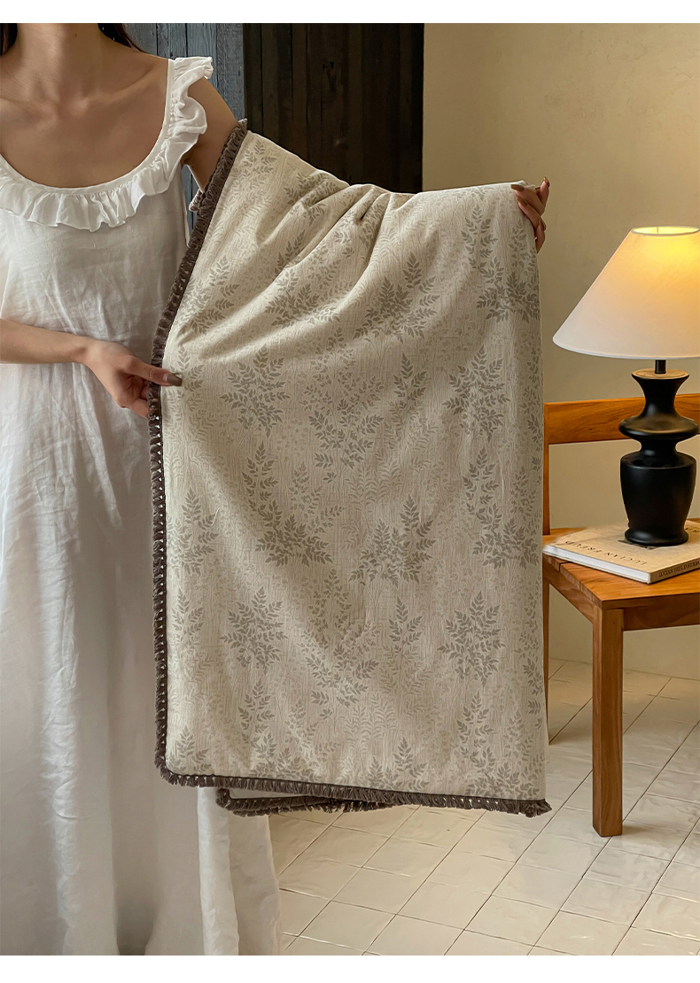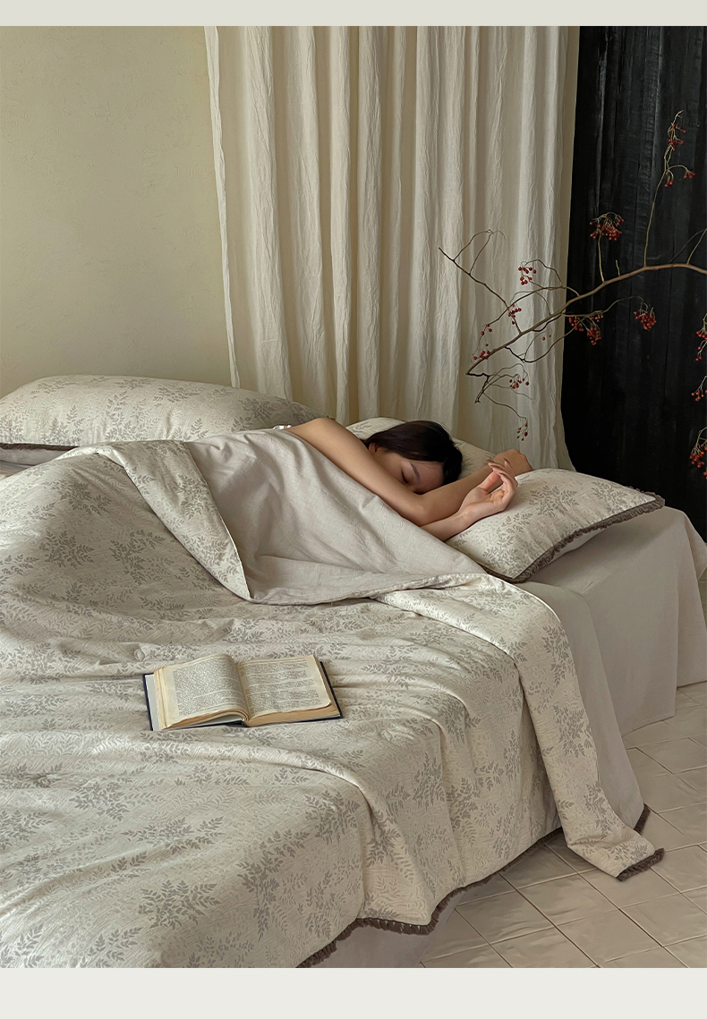 • 91家纺网 家纺一手货源 找家纺 一加一 2026新款A类棉麻透气提花花边凉感夏被夏凉被空调被四件套棉麻叙 枫叶-灰