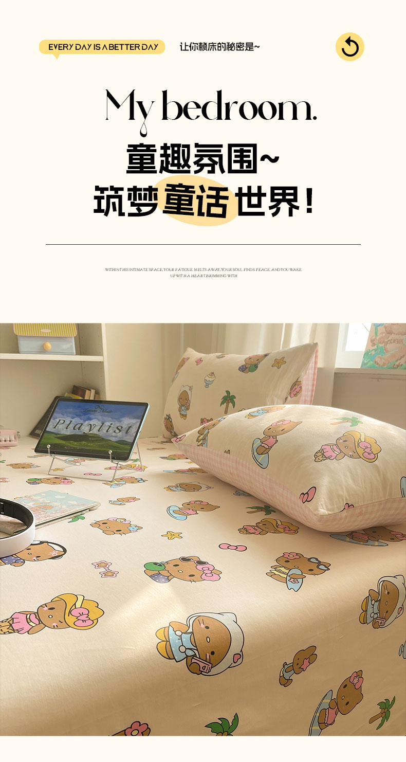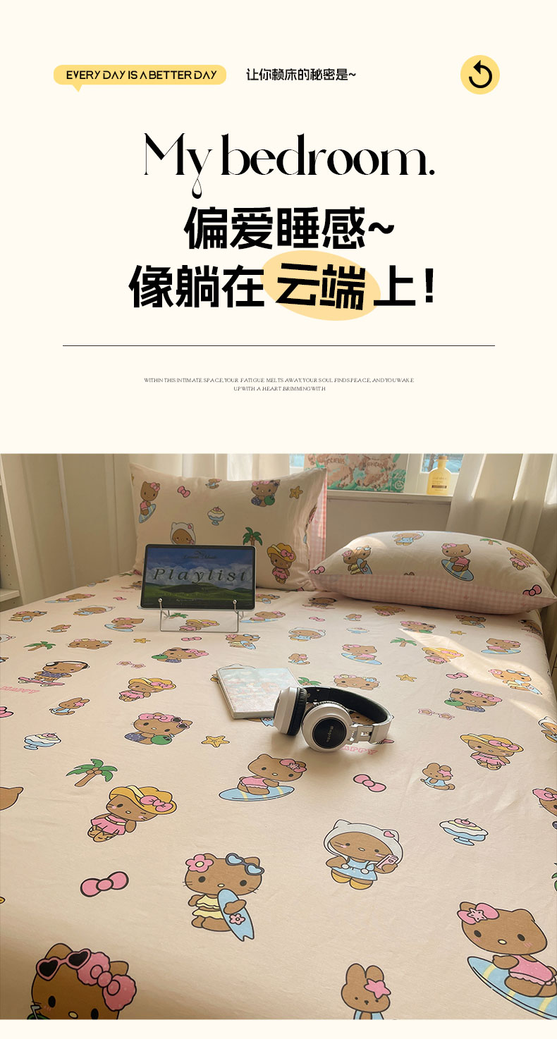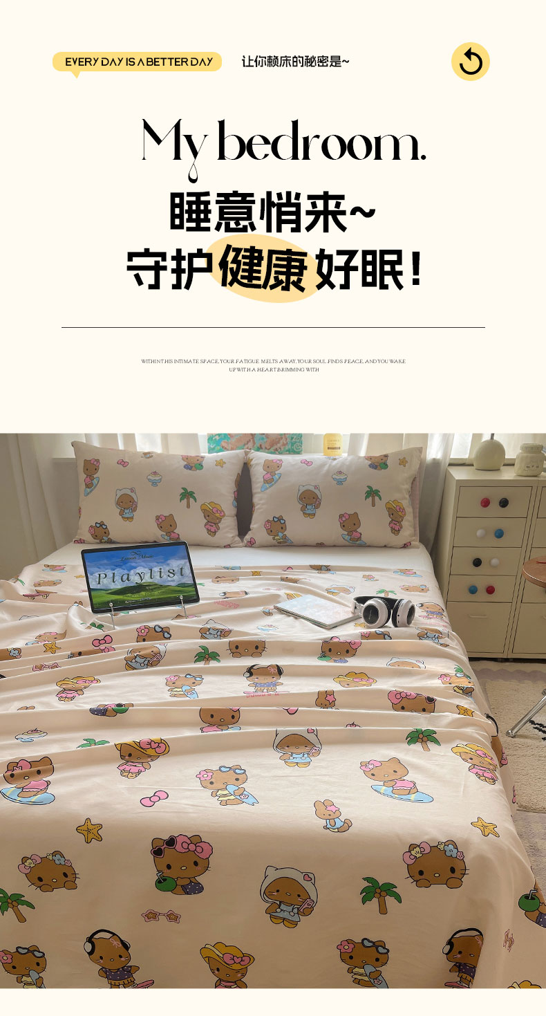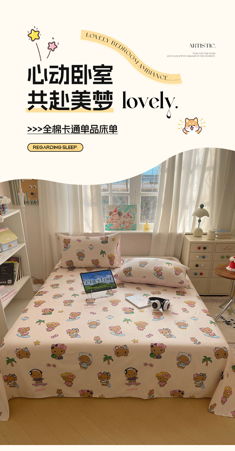 六巷胡同 2026新款40支全棉13070INS卡通全棉单品床单 度假冲浪猫