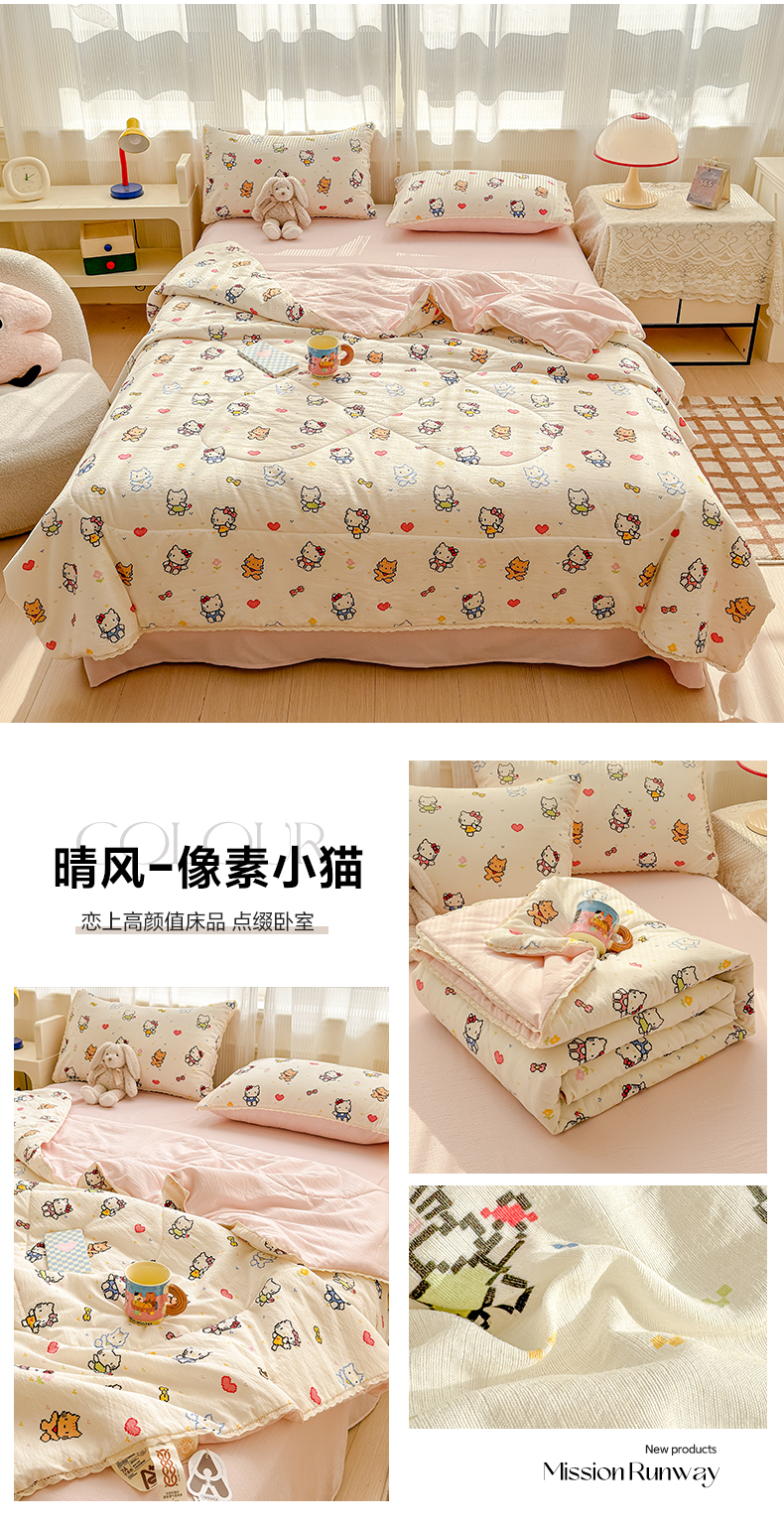 (总)贝扬思家纺 2025新款三丽鸥简约条纹夏被夏凉被空调被套件系列,奶油条kt粉粉,奶油条kt粉黄,奶油条kt黄黄,奶油条kt蓝蓝,奶油条kt紫紫