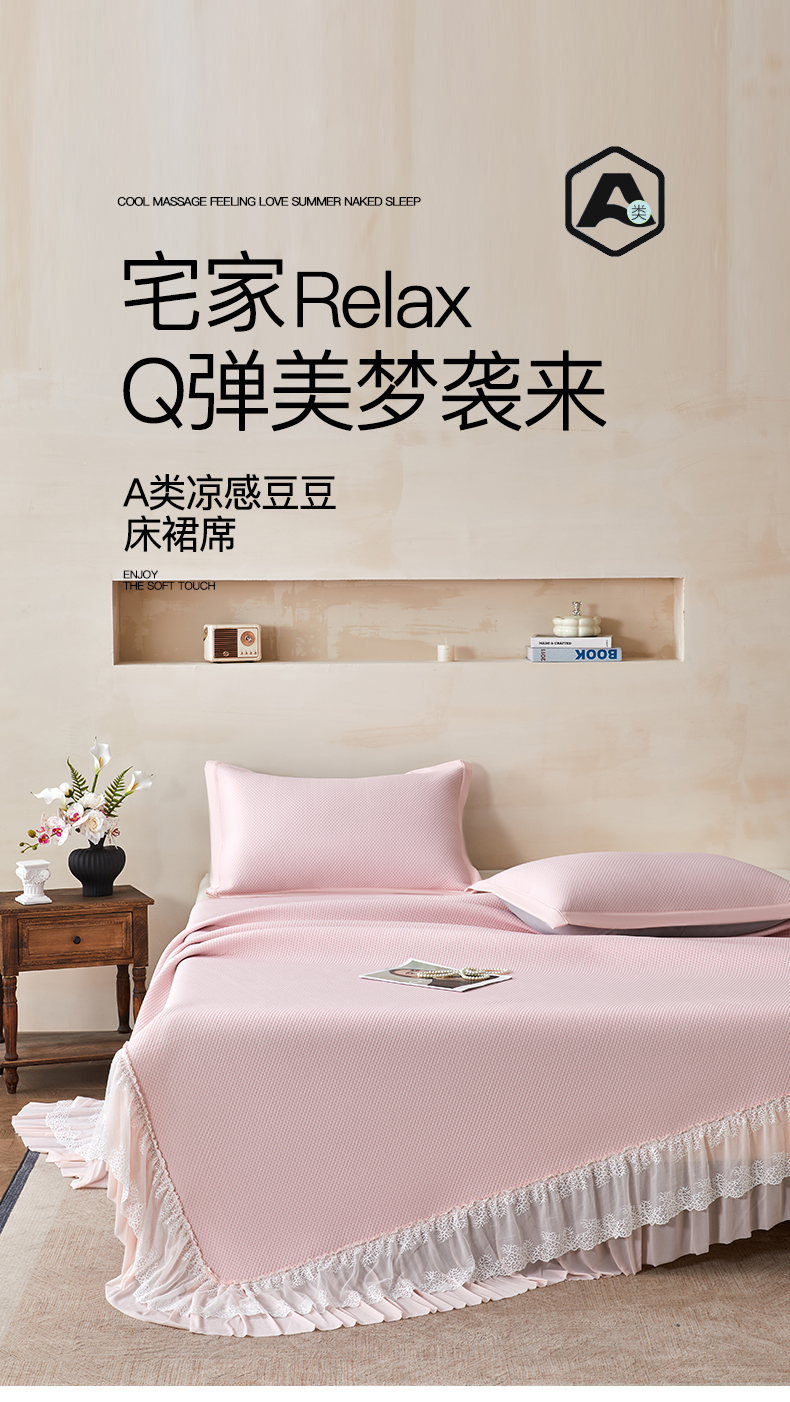 (总)航途席业 2026新款A类凉感豆豆床裙款凉席三件套-系列五,冰蓝绮梦,奶白绮梦,青柠绮梦,樱粉绮梦,月灰绮梦