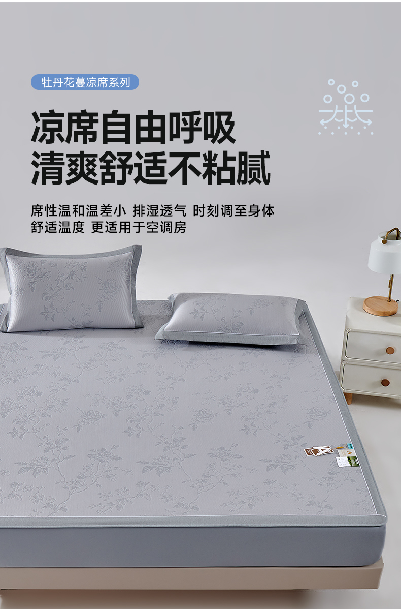 商品名称:小牛席业 2026新款牡丹花蔓冷感豆豆席凉席席子-床笠款 牡丹花蔓-灰色