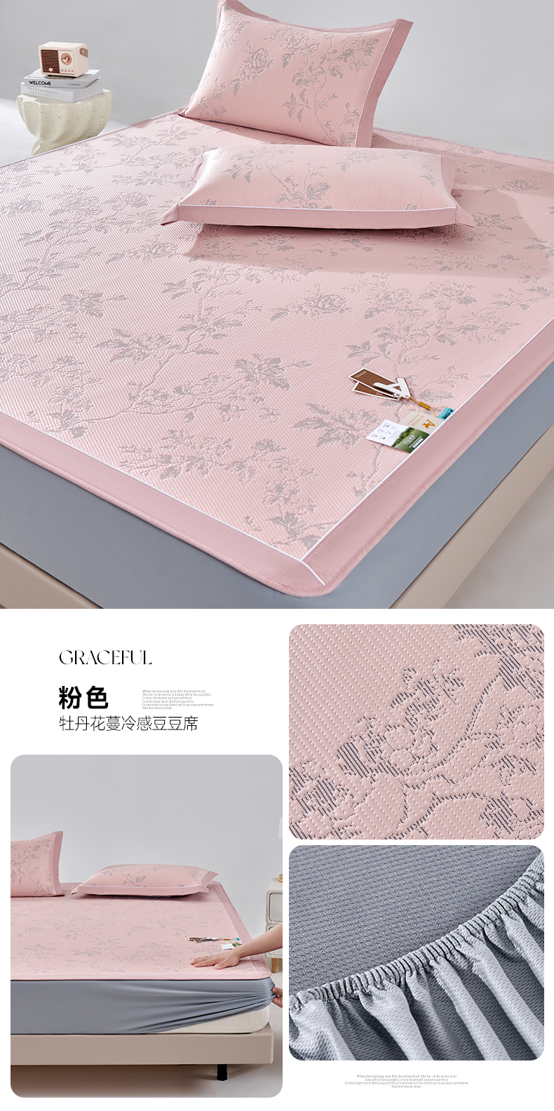 (总)2023新款超精密冰丝席-小斜纹系列-床笠款藤席凉席竹席,粉色,蓝色,绿色,银灰