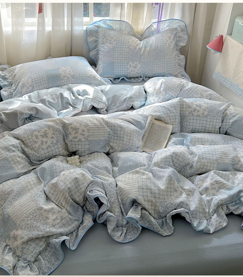 (总)睡美美家纺 2026新款皱皱纱肤感花边四件套,百福蓝,绿野,梦境织格,摩卡樱桃,桃乐丝,夭夭,莹光,旧梦蔷薇,紫风铃