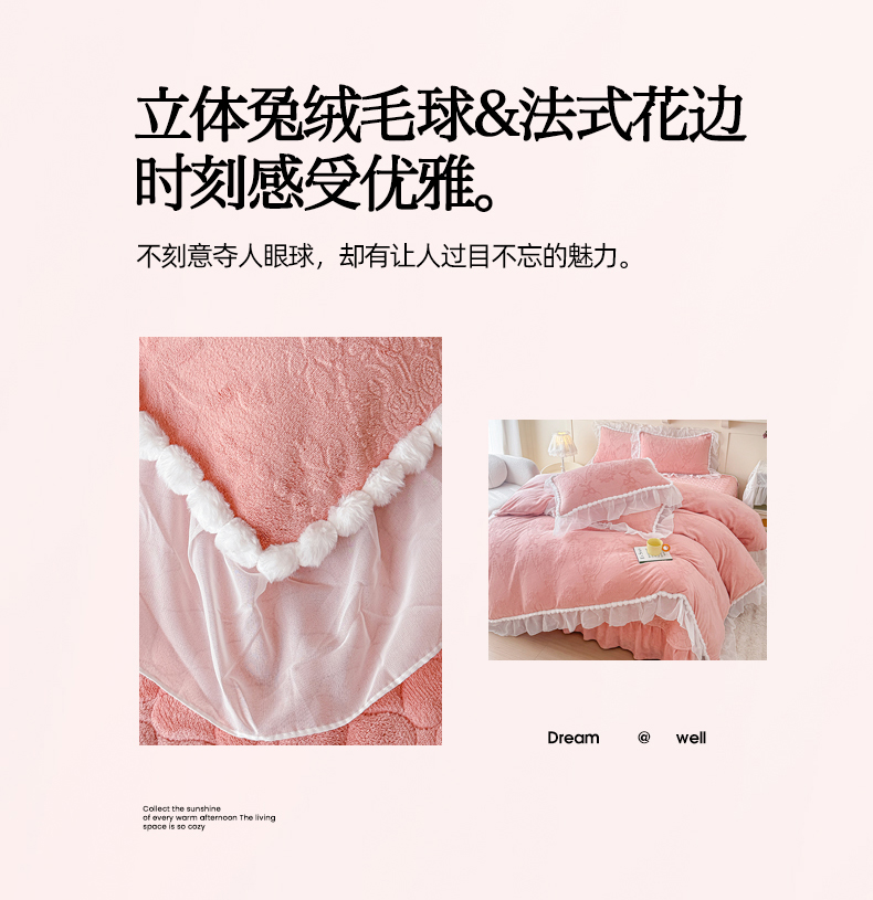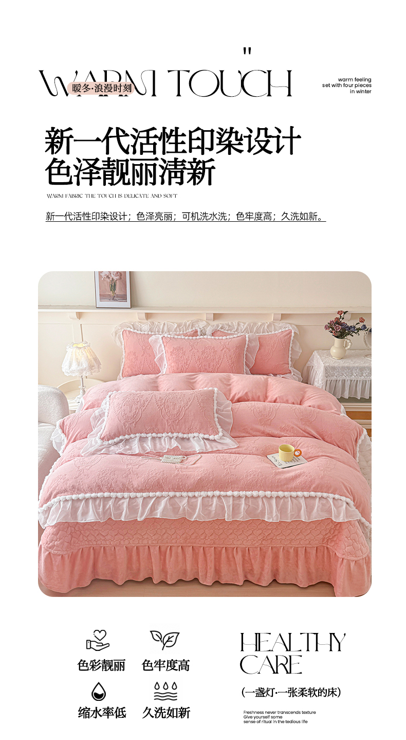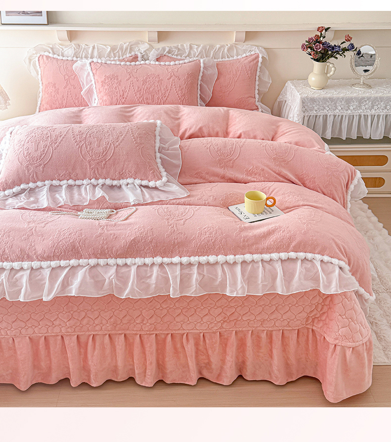 当前位置: 91家纺网 > 商品网购 > 床品套件 > 四件套 > 牛奶绒四件套 > (总)莉迪娅 2026新款230克全消光立体雕花牛奶绒夹棉床盖四件套法式大花边兔毛绒毛球加棉加厚保暖三四件套-唯爱