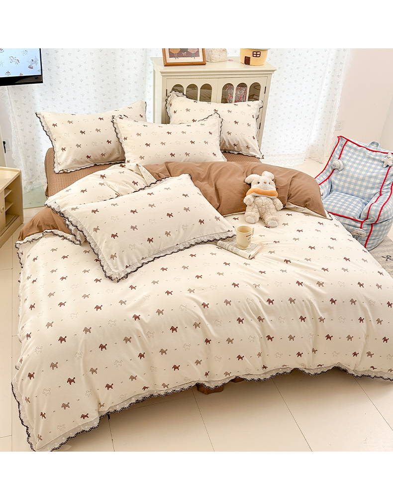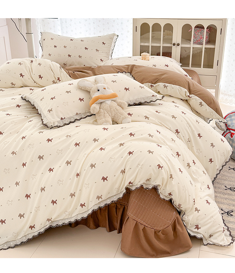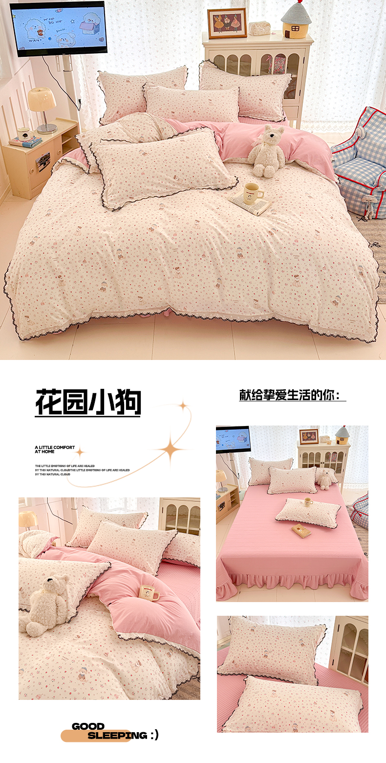 (总)莱米家纺 2026春夏新款亲肤花边全棉床盖四件套,春日小马,花团锦簇,花园小狗,苹果小熊,温柔蜜语-粉,温柔蜜语-蓝,小彩虹,紫韵