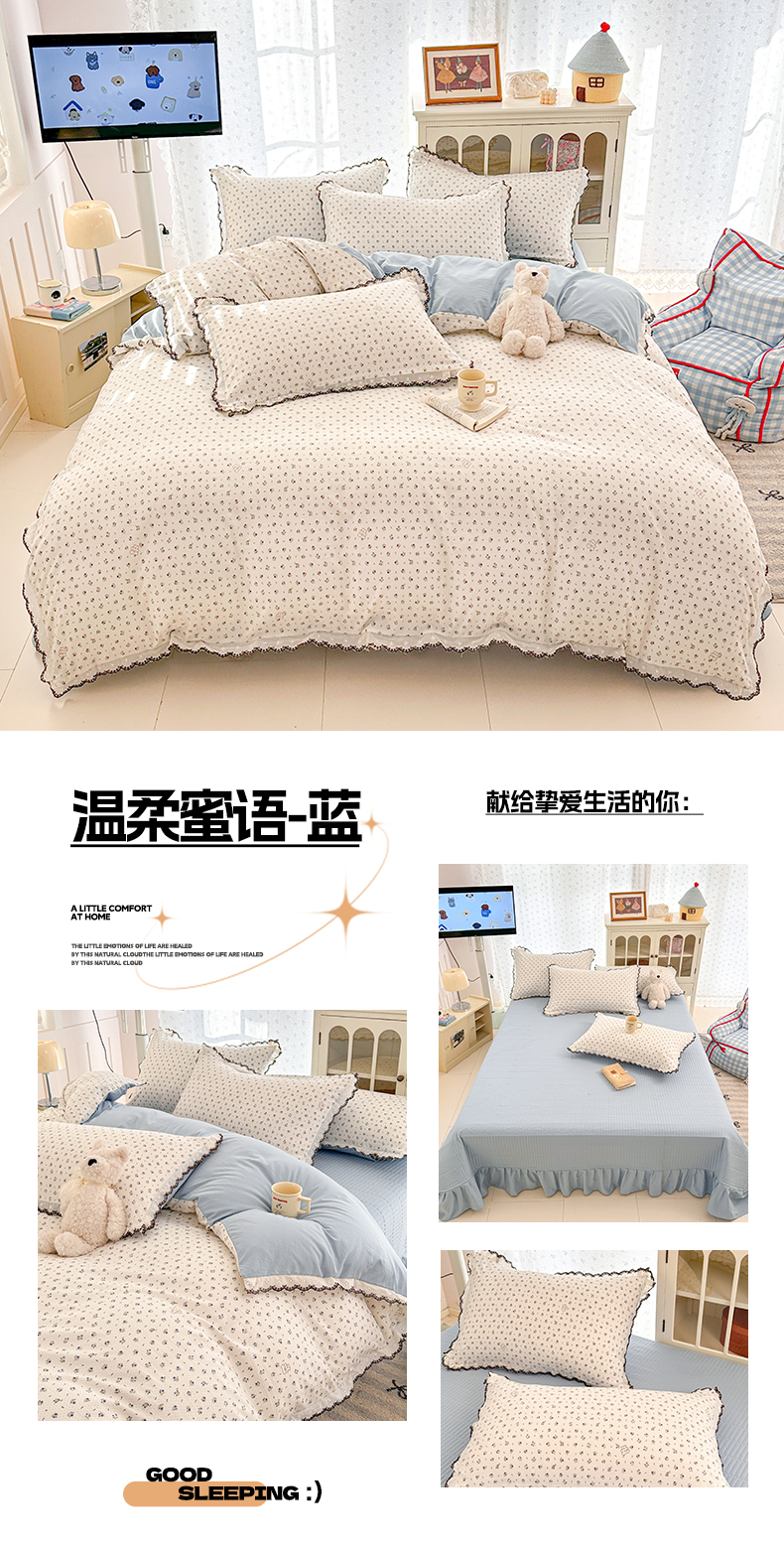 莱米家纺 2026春夏新款亲肤花边全棉床盖四件套 温柔蜜语-蓝